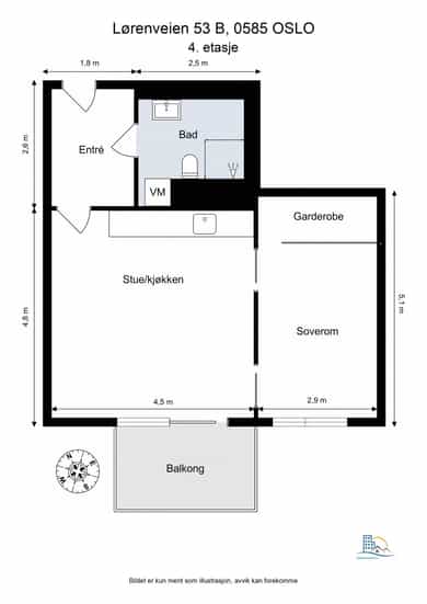 BRA-i: 48 kvm. Entré, bad, soverom, kjøkken, og stue
