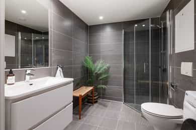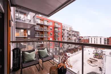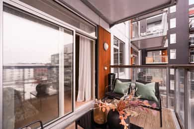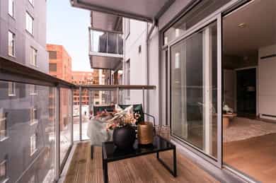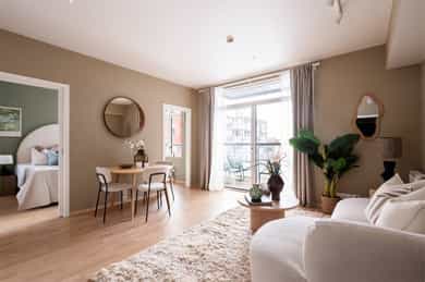 Stue: Lys og innbydende stue med store gulv-til-tak-vinduer som slipper inn rikelig med naturlig lys. Stuen tilbyr gode møbleringsmuligheter, med plass til både sofaseksjon med tilhørende møbler og et spisebord for hyggelige sammenkomster. Fra stuen er det utgang til balkongen, som fungerer som en forlengelse av oppholdsrommet i sommerhalvåret. Balkong: Stor, sydvestvendt balkong på 6,4 kvm med åpen og luftig utsikt mot fellesområdene. Her er det plass til sittegruppe, elektrisk grill og dekorative planter. Balkongens glassrekkverk sørger for rikelig lys inn i leiligheten, og den overbygde utformingen gjør at sesongen kan nytes lenge. Kjøkken: Kjøkkenet ligger i åpen løsning mot stuen, noe som skaper en sosial og luftig planløsning. Innredningen har lyse, glatte fronter og laminat benkeplate, med godt med skap- og benkeplass. Integrerte hvitevarer inkluderer platetopp (ny i 2024), stekeovn, oppvaskmaskin og kjøl-/fryseskap, med ventilator plassert over kokeplassen. Bad: Romslig og moderne bad med vegghengt toalett, servant nedfelt i innredning, speil og dusjhørne med svingbare glassdører. Badet har opplegg for vaskemaskin, balansert ventilasjon, flislagt gulv med gulvvarme, flislagte vegger og malte plater med integrerte downlights i himlingen. Soverom: Soverommet vender mot rolig indre gårdsrom og har god plass til dobbeltseng, nattbord og kommode eller kontorløsning. I tillegg har rommet en praktisk walk-in-closet som gir rikelig med oppbevaringsplass. Entré: Lys og innbydende entré som skaper et flott førsteinntrykk av leiligheten. Her er det plass til oppheng av ytterklær og skoplassering, med mulighet for skoskap, kommode eller annen oppbevaring. Dørcalling er praktisk plassert ved inngangsdøren. Tilstandsrapport for boligen er vedlagt salgsoppgaven. Se denne for nærmere informasjon om tilstandsgrad.