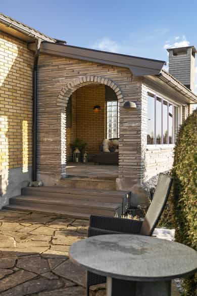 TBA i 1. etasje er en veranda, skiferlagt uteplass, trapp med repos ved inngang og en platting.