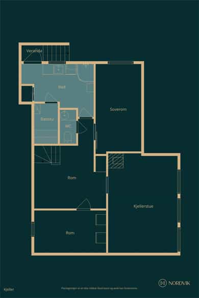 BRA-i: 76 kvm. Hall/gang, toalettrom, vaskerom, bod, kjellerstue og soverom.