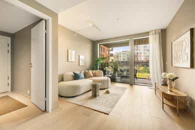 4-roms m/vestvendt balkong i 2 etg. 2 bad. Kjøkken i midten. Garasjepl. m/elbillader mot tillegg. Selvaag Plusskonsept.