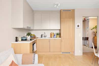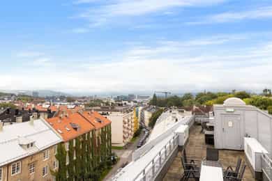 Leiligheten inneholder: Entré, stue, åpen kjøkkenløsning, soverom og baderom. Borettslaget har felles takterrasse med sol hele dagen og fantastisk utsikt. Takterrassen er av god størrelse og er inndelt i flere soner. Takhøyden i stuen ble målt til 2,49 m og er noe høyere enn vanlig. Her får du en svært god intern beliggenhet i et veldrevet borettslag. Leiligheten vender mot en skjermet bakgård og ligger svært rolig til, samtidig som du har alt utenfor døren. Entré: Velkommen inn! En lys og innbydende entré gir et godt førsteinntrykk av leiligheten. Her er det skyvedørsgarderobe med god plass til sko og yttertøy. Det er installert dørcalling. Stue: Lys og hyggelig stue med store vindusflater som gir rikelig med luft og lys. Leiligheten vender i sin helhet mot indre gårdsrom og har åpent, grønt utsyn, samt nydelige lysforhold. Planløsningen er sosial og arealeffektiv, med åpen stue-/kjøkkenløsning. I stuen er det plass til sofaseksjon, TV-møblement og spisegruppe. Her er det god plass til å samle vennegjengen! Stuen har fransk balkong, og borettslaget byr i tillegg på en felles takterasse med fantastisk utsikt og sol hele dagen. Kjøkken: Nydelig Epoq-kjøkken fra 2024 med eikefronter og laminat benkeplate med underlimt vask. Kjøkkenet har integrerte hvitevarer med komfyr og induksjonstopp fra Bosch, ekstra stort kjøleskap, fryseskap, oppvaskmaskin, samt uttrekkbar vifte som styrer ventilasjonen i hele leiligheten. Kjøkkenet byr på rikelig med oppbevaringsplass i overskap. Soverom: Romslig soverom med plassbygd skyvedørsgarderobe med speilfronter. Her er det god plass til dobbeltseng og tilhørende møblement. Leilighet er tilbaketrukket fra all støy og her sover man godt med vinduet åpent om natten. Baderom: Stort, flislagt bad med gulvvarme. Himling med malte plater og innfelt downlights. Badet er innredet med klosett, servant nedfelt i innredning og dusjhjørne med svingbare glassdører. Det er opplegg for vaskemaskin. Mekanisk avtrekk.
