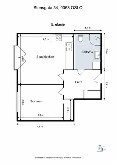 BRA-i: 43 kvm. Entré, bad, soverom, kjøkken og stue.
