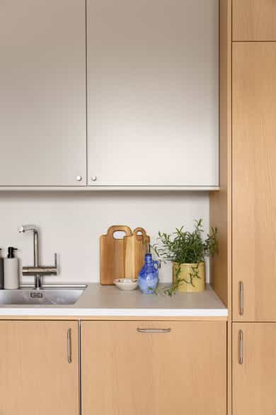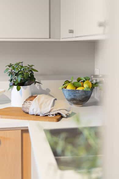 Nytt kjøkken med påkostninger som eikefronter, vask, komfyr og induksjonstopp fra Bosch, ekstra stort kjøleskap, uttrekkbar vifte som styrer ventilasjonen i hele leiligheten. Nye overskap utnytter takhøyden og gir betydelig bedre lagringsplass.