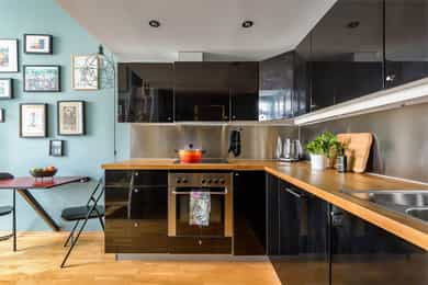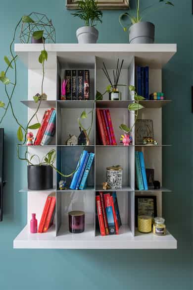 - Fastmonterte hyller i stue: bokhylle, svart hylle og hvit hylle