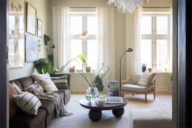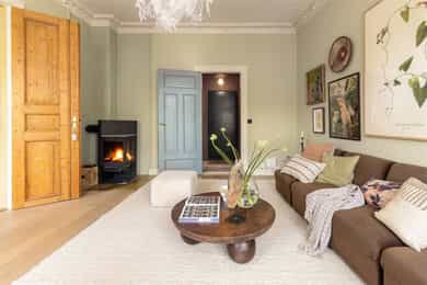 Stilren, klassisk og gjennomgående 3-r selveier - Generøs takhøyde, peis og doble fløydører - Tilbaketrukket beliggenhet