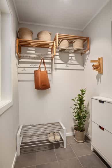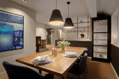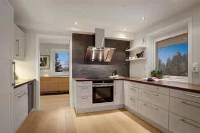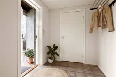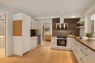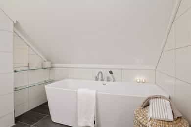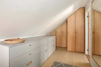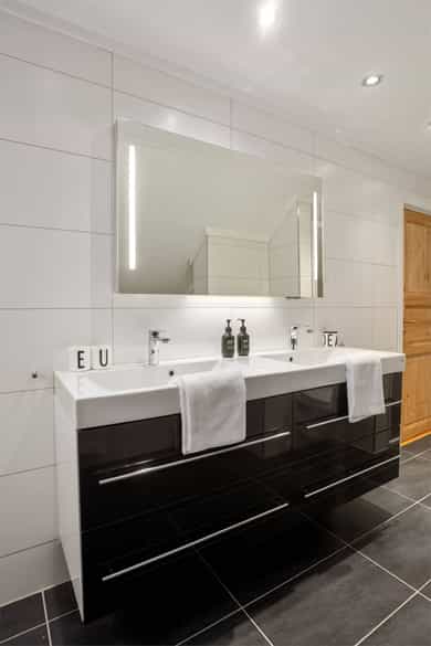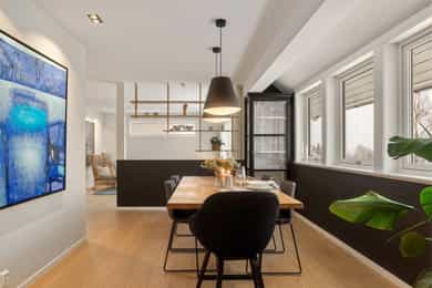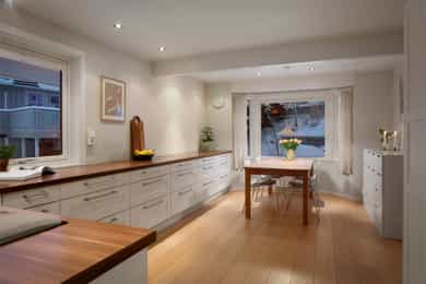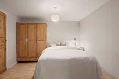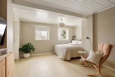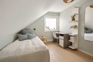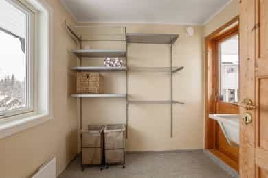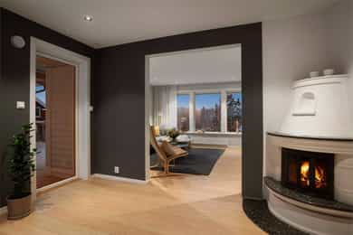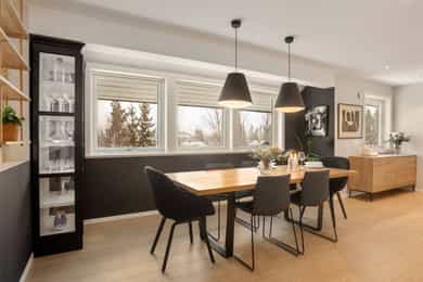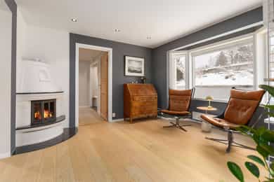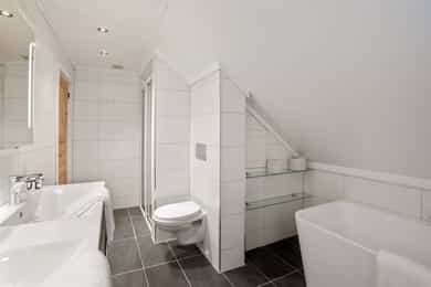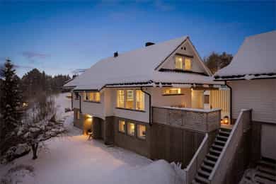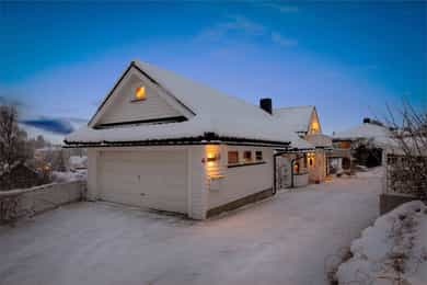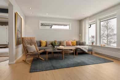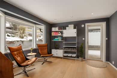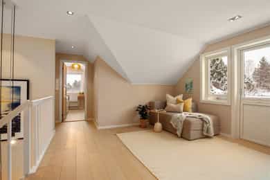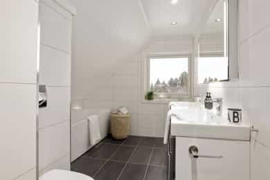 Entré Entréen gir et godt førsteinntrykk med god plass til yttertøy og sko. Tidligere bod er innlemmet i entréen og benyttes i dag som garderobeløsning. Dette er ikke omsøkt hos kommunen, se pkt. om ferdigattet. Entréen fungerer som et naturlig bindeledd til boligens øvrige rom. Stue og spisestue Boligen holder gjennomgående god standard på innredninger, overflater og utstyr, med lyse og tidsriktige fargevalg på vegg- og himlingsflater. Store vindusflater slipper inn rikelig med naturlig lys og bidrar til en lys og trivelig romfølelse. Stueløsningen er romslig og gjennomtenkt, med to stuer og spisestue i naturlig sammenheng. Stue 1 fungerer som hovedoppholdsrom og er utstyrt med vedovn som gir god varme og et hyggelig preg. Stue 2 har plassbygd peisovn og utgang til terrasse, noe som gir en naturlig forlengelse av oppholdsarealet i sommerhalvåret. Spisestuen er sentralt plassert med god plass til større spisebord og sosiale sammenkomster. Downlights i himling sørger for jevn og behagelig belysning i hele oppholdsarealet. TV-stue I 2. etasje er det etablert en trivelig loftstune med plassbygde skap som er tegnet av interiør arkitekt Ida Harr og bygget på vestlandet av Nesje i Heltre Eik og utgang til veranda. Rommet egner seg godt som ekstra oppholdsrom og gir en fin adskillelse mellom oppholds- og sone for soverom. Kjøkken Stilrent kjøkken med praktisk utforming. Kjøkkeninnredning fra 2010 med hvite, glatte fronter, bestående av både over- og underskap samt belysning under overskap. Benkeplate er i laminat, nedfelt oppvaskkum med ettgreps svingbare blandingsbatteri i krom med dusj. Kjøkkenet er utstyrt med integrerte hvitevarer bestående av induksjonsplatetopp, stekeovn, oppvaskmaskin og kjøleskap. Kjøkkenet ligger i naturlig tilknytning til spisestuen og gir en sosial planløsning. Soverom Boligen har tre soverom samlet i 2. etasje, alle med gode planløsninger og integrerte oppbevaringsløsninger. Hovedsoverommet har plassbygd garderobe- og skuffesystem samt tilgang til kneloft. De øvrige soverommene har plassbygde garderober og tilgang til kneloft, og egner seg godt som barnerom, gjesterom eller kontor. Baderom Boligen har to baderom. Baderommet i 1. etasje er innredet med servantskap med nedfelt servant, veggskap med speil og belysning, gulvmontert toalett og dusjkabinett. Varmekabler i gulv gir god komfort, og nedsenket himling med downlights sørger for behagelig belysning. Baderommet i 2. etasje er romslig og moderne utformet, og inneholder servantskap med dobbel servant, speil med innebygd belysning, vegghengt toalett med innebygd sisterne, dusjnisje med glass-skyvedør samt frittstående badekar. Varmekabler i gulv og downlights i nedsenket himling bidrar til et helhetlig og komfortabelt uttrykk. Vaskerom Separat vaskerom i 1. etasje med praktisk adkomst til overdekket balkong. Rommet er utstyrt med vaskekum, veggskap og opplegg for vaskemaskin, og fungerer godt som en funksjonell støttefunksjon i hverdagen. Underetasje - boligdel Underetasjen har felles entré med adkomst til både boligdel og hybel. Det gjøres oppmerksom på at alle rom i underetasjen, både hoveddel og hybel, er byggemeldt som disponible rom/hobbyrom/boder og ikke er godkjent for varig opphold, se pkt. om ferdigattest. Opprinnelig hobbyrom er innredet som kjellerstue/soverom. Dette er ikke omsøkt hos kommunen, se pkt. om ferdigattest. Det er videre to boder med gode lagringsmuligheter, hvorav den ene inneholder radonavtrekk og den andre rommer varmtvannsbereder, vannmåler og hovedstoppekran. Hybel Hybelen i underetasjen er innredet med stue, kjøkken, soverom samt bad/vaskerom. Dette er ikke omsøkt hos kommunen, se pkt. om ferdigattest. Stuen har god plass til både sofa og spisebord, mens kjøkkenet er utstyrt med hvit kjøkkeninnredning med profilerte fronter, over- og underskap og belysning under overskap. Soverommet har garderobeskap, og bad/vaskerommet inneholder servantskap, speil med belysning, gulvmontert toalett, dusjkabinett og opplegg for vaskemaskin. Selger har leid ut hybelen i sin eiertid.