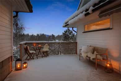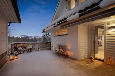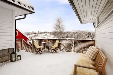 Boligen har flere varierte og solrike uteplasser som gir gode bruksmuligheter gjennom hele dagen. Fra stuen i 1. etasje er det utgang til en vestvendt terrasse på ca. 32 kvm, med god plass til både spisegruppe og sittegrupper, samt trapp ned til hagen. I 2. etasje er det utgang til en sydvendt veranda på ca. 5,8 kvm fra TV-stuen, samt en overbygget balkong på ca. 4,9 kvm med adkomst fra vaskerom.