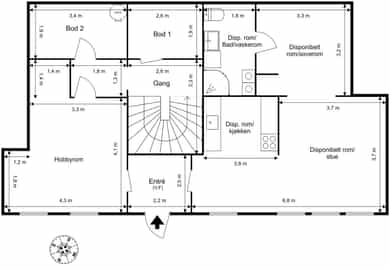 BRA-i: 91 kvm. Entré, gang, hobbyrom og 2 boder. Disponible rom i hybeldelen brukes idag til kjøkken/stue, soverom og bad/vaskerom.