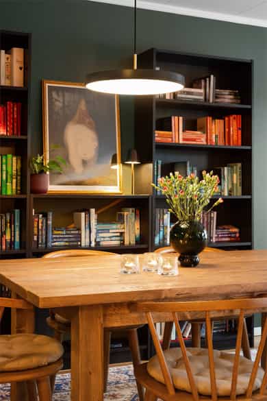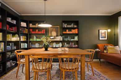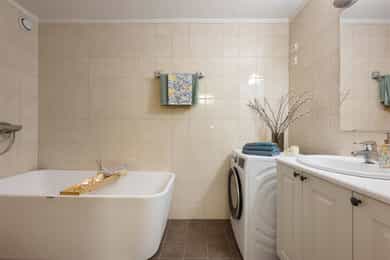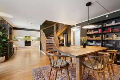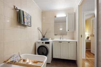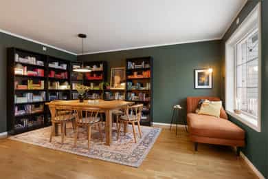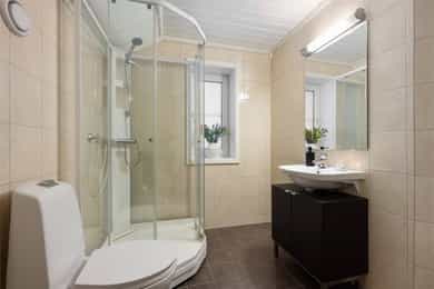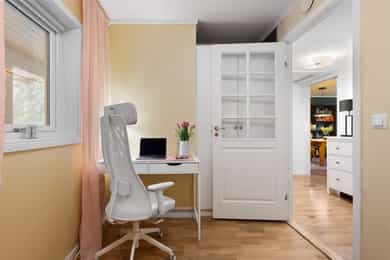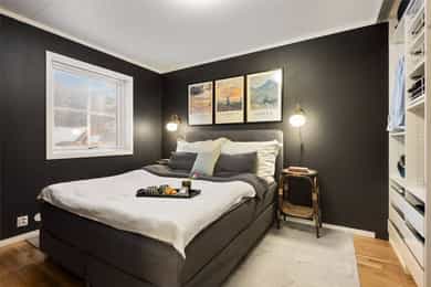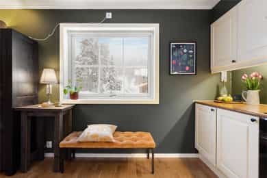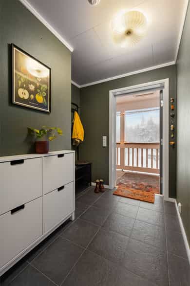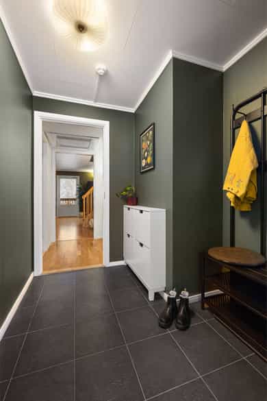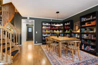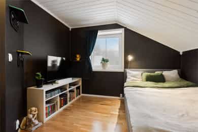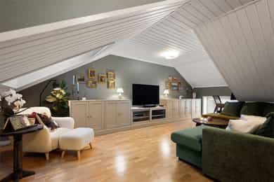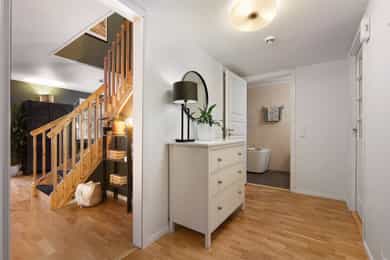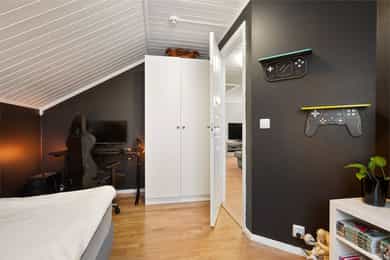 Entré Boligen har adkomst via utvendig trapp til en praktisk entré. Her er det lagt mørke fliser på gulv med behagelig gulvvarme. Veggene er malt tapet i en dempet og gjennomført fargetone. Entréen har plass til oppheng av yttertøy samt skoskap. Stue og spisestue Boligen har et stort og romslig oppholdsrom i hovedetasjen, som i dag er innredet som en generøs spisestue. Rommets gode utforming gir fleksible møbleringsmuligheter, og det er mulig å innrede med et mindre spisebord og en egen sofakrok dersom ønskelig. Det er 3-stavs parkett på gulv og malt tapet på vegger. Himlingen er utført med tak-ess. Fra rommet er det dør med utgang til sørvest-vendt balkong, som gir gode lysforhold. Kjøkken Kjøkkenet har en klassisk og tidløs utforming med kjøkkeninnredning bestående av profilerte hvite fronter. Benkeplaten er i laminat og det er nedfelt vaskekum i børstet stål, med ettgreps krummet armatur fra Gustavsberg. Over stekesonen er det mekanisk avtrekksvifte. Det er montert stekeovn, platetopp, oppvaskmaskin og frittstående kjøleskap med fryser. Hvitevarene medfølger ved salg. Videre er det etablert komfyrvakt som gir en fin sikkerhet. Soverom Boligen har totalt tre soverom, hvorav to er plassert i hovedetasjen og ett i øverste etasje. Hovedsoverommet i hovedetasjen har god plass til dobbeltseng og er utstyrt med garderobeløsning som gir rikelig med oppbevaringsplass. De øvrige soverommene har gode størrelser og egner seg svært godt som barnerom, gjesterom eller hjemmekontor. Samtlige soverom har 3-stavs parkett på gulv og malt tapet på vegger. Bad/vaskerom i 2. etasje Kombinert bad og vaskerom beliggende i 2. etasje. Rommet er utført med fliser på gulv og fliser på vegger, samt tak-ess i himling. Det er varme i gulvet. Badet er utstyrt med mekanisk avtrekk, opplegg for vaskemaskin, toalett og badekar med ettgreps krummet dusjarmatur. Videre er det servantskap med lyse profilerte fronter og hvit keramisk servant, kombinert med ettgreps krummet armatur fra Gustavsberg. Bad i loftsetasje Boligens andre bad ligger i øverste etasje, i tilknytning til loftstue og ett av soverommene. Rommet er utført med fliser på gulv og fliser på vegger, samt malt panel i himling. Det er varme i gulvet. Badet er utstyrt med mekanisk avtrekk, toalett og dusjkabinett med skyvedører og ettgreps krummet dusjarmatur. Videre er det hvit keramisk servant med ettgreps krummet armatur fra Gustavsberg. Et vindu på veggen gir naturlig lys til rommet, samtidig som det gir mulighet for frisk luft. Loftstue Romslig loftstue med god plass til stor sofagruppe, og som egner seg svært godt som TV-stue eller ekstra oppholdsrom. Den gode gulvplassen og den lune utformingen gjør rommet lett å møblere med både sittegruppe og eventuelt arbeidsplass. Det er 3-stavs parkett på gulv og malt tapet på vegger. Himlingen er utført med malt panel, som følger rommets skråtak. Lagringsplass Leiligheten har et teknisk rom kombinert med bod i 2. etasje. Videre er det lagringsplass i kneloft i øverste etasje (ikke målbart areal). På endeveggen i 1. etasje er det en utvendig sportsbod på ca 5 kvm.