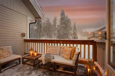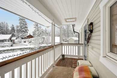 Fra stuen er det utgang til en sydvest-vendt veranda på ca. 7 kvm. Verandaen har fint utsyn, gode solforhold og det er plass til sittegruppe og utemøbler. Det er montert markise, stikkontakt og utebelysning. På motsatt side ved inngangspartiet er det en overbygd veranda på ca. 6 kvm som vender mot nord.