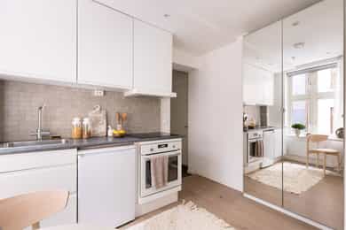 Hybel: Entré, stue, kjøkken og bad.