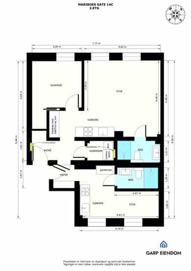 Hoveddel: Entré, stue, kjøkken, soverom og bad. Hybel: Entré, stue, kjøkken og bad. Parkering: Gateparkering. Tidvis mulighet for å leie parkeringsplass i felles garasje. Eksterne boder: Kjellerbod på 5 kvm. Takhøyde: Takhøyden er målt til 260 cm i stuen.