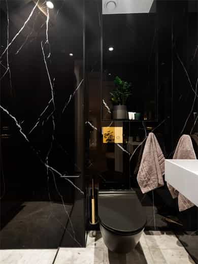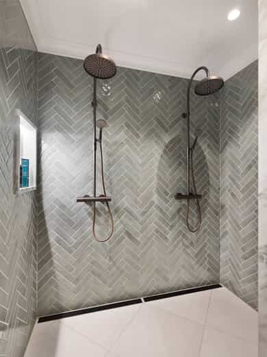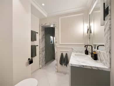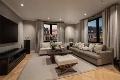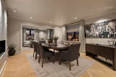 Om leiligheten: For tilstandsgrader se punktet "Takst og Tilstand" og underpunktet "Byggemåte" for informasjon. Kjøkken: Sigdal innredning med beisede fronter. Takhøye skap. Fliser på vegg mellom benk og overskap. Frittstående kjøkkenøy. Polert naturstein benkeplate med to underlimte kummer. Innfelt elektriske artikler med stekeovn, komfyr med keramisk topp og integrert kullfilter avtrekksvifte. Kaffemaskin, mikrobølgeovn, kjøleskap og fryser. Spiseplass på en side av kjøkkenøyen. Det er montert komfyrvakt og automatisk vanstopp ved lekkasje i benk. Kullfilter avtrekksvifte integrert i komfyrtoppen. Bad I: Adkomst til baderommet fra hovedsoverom. Gulvet er flislagt med elektriske varmekabler. Fliser dusjen, øvrige vegger er malt. Taket er malt. Badet er innredet med 2 dusjer, wc og servant. Hvit porselen. Stort dusjrom med 2 vegghengte dusjer, samt løs slange med dusjhode. Vegghengt toalett med skjult sisterne. Benk med folierte fronter og marmor benkeplate med nedfelt underlimt servant. Stor speile over benken med marmor kant. Skap over toalett. Marmor omramning i åpning til dusjen. Downlights i himlingen. Aktuell byggeforskrift er teknisk forskrift 2017. Dokumentasjon foreligger. Bad II: Inngang til baderommet fra gangen. Baderommet er bygget og innredet av tidligere eier i 2020. Marmor fliser på gulvet. Rommet har elektriske varmekabler. Veggene har baderomsplater. Taket er malt. Nedsenket gulv i dusjen med sluk. Badet er innredet med dusj, wc og servant. Hvit porselen. Nedfelt gulv i dusjen med rennesluk og hengslet dør i fronten. Vegghengt toalett med skjult sisterne. Downlights i himlingen. Ventil i himlingen for ventilasjon. Aktuell byggeforskrift er teknisk forskrift 2017. Vaskerom: Vaskerom med adkomst fra entré. Gulv med marmor fliser og elektriske varmekabler. Veggene har fliser og malte overflater. Taket er malt. Benk og skap med folierte glatte fronter. Marmor benkeplate med en underlimt kum. Opplegg for vaskemaskin og tørketrommel. Aktuell byggeforskrift er teknisk forskrift 2017. Dokumentasjon foreligger. Innvendige overflater: Gulv: Fliser i hall og hovedbaderom. Marmorfliser i lite baderom og vaskerom. Øvrige overflater har heltre parkettstaver i fiskebensmønster. Vegger: Malt i hovedbaderom med fliser i dusjen. Marmor formende plater i lite baderom. Tapet i spisestuen og stuen. Øvrige overflater er malt. På vegger i entré og gang det laget spiler på vegger med innramming av listverk. Himling: Malte overflater i alle rom. Montert downlights i alle himlinger. Takhøyder: Spisestuen ca. 2,63 meter. Kjøkken ca. 2,64 meter. Soverom ved entré ca. 2,65 meter. Det gjøres oppmerksom på at målinger er foretatt tilfeldig steder i leiligheten. Ved måling på andre steder i boligen, kan dette gi ett annet resultat på takhøyder. Ildsted: Det er montert Biopeis i spisestuen av en tidligere eier. Marmorforblending er fra 2024, sammen med skap som omslutter peisen. Plasttank for brensel er plassert i skap ved siden av Biopeisen. Bygningen har mursteinspipe. En teglskorstein må oppstilles slik at alle fire sidene er tilgjengelige for inspeksjon med hensyn til eventuelle sprekker i skorsteinen. Det er ikke tillatt å bruke kledninger, belegg eller tapetser som skjuler tegloverflaten for inspeksjon med hensyn til sprekker. Tynne papirtapeter, som eventuelt vil sprekke opp sammen med skorsteinen kan likevel brukes. Ventilasjon: Boligen har balansert ventilasjon. Balkong: Balkong på ca, 8 m² med adkomst fra hovedsoverom. Balkongen er vestvendt og vender mot bakgårdsrom. Balkongen er oppført i betong med fliser på gulvet. Malt rekkverk i stål med høyde 1,0 meter. Skap: Leiligheten har plassbygde skap i entré og alle soverom. I hovedsoverom er det forskjellige skap. En del i treverk med glassdører, synlige hyller og belysning. En del med lukkede skap. I de to mindre soverommene er det faste skap med integrert skrivepult i malt utførelse og med tapet på front av dørene. Diverse utstyr: • Porttelefon. • Opplegg for kabel-tv/bredbånd. • Røykvarsler og egnet slukkemiddel skal følge boligen ved salg. Selgers egenerklæring ligger vedlagt i salgsoppgaven. Det er utarbeidet en tilstandsrapport for boligen. Denne følger vedlagt i salgsoppgaven. Se denne for nærmere informasjon. Erfaringsmessig bør det alltid påregnes noe kosmetisk oppgradering av utstyr, overflater og innredninger i brukte boliger. Det vises forøvrig til rapporten for beskrivelser og vurderinger av tilstandsgrader. Alle innvendige og utvendige arealangivelser, samt beskrivelser av bygningen er hentet fra vedlagte tilstandsrapport/boligsalgsrapport. Salgsoppgaven er basert på selgers opplysninger til takstmann og megler. Videre er det innhentet opplysninger fra kommunen og andre relevante kilder. Tomtegrenser er ikke kontrollert. Det kan være avvik fra dagens rombruk/rombenevnelser sammenlignet med det som er byggemeldt/godkjent. Meglerforetaket oppfordrer interessenter til å lese gjennom fullstendig prospekt/salgsoppgave med vedlegg. Interessenter oppfordres også til å undersøke eiendommen nøye, gjerne sammen med sakkyndig. Dette bør gjøres før bud inngis.