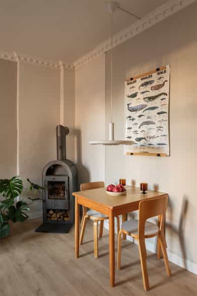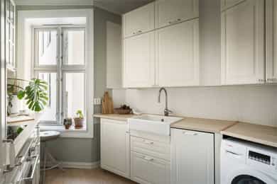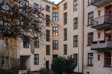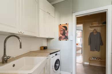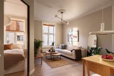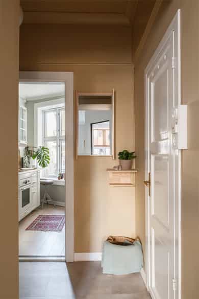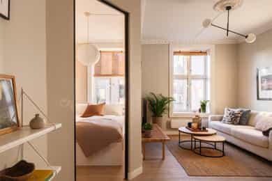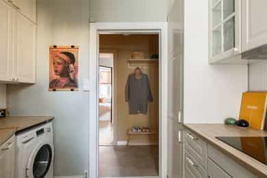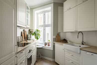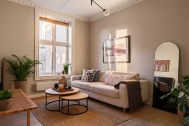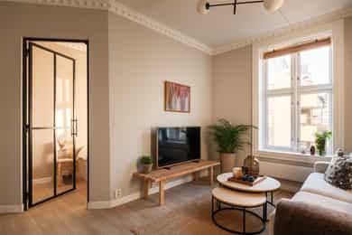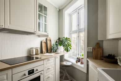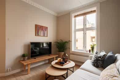 Entré Velkommen inn! Entréen gir et godt førsteinntrykk av leiligheten. Her er det gode muligheter for oppheng av yttertøy og oppstilling av sko. Innredningen i entréen medfølger i salget. Entréen er i senere tid oppgradert med løfting av takhøyden og nymalte vegger i en flott gulfarge. Her er det lagt vinyl i flismønster på gulvet. Dørcallinganlegg. Kjøkken Klassisk og tidløst Ikea-kjøkken fra 2017. Kjøkkenet ligger i et separat rom. Flott kjøkkeninnredning med profilerte fronter. Enkelte glassfronter i overskap. Stilige mosaikkfliser på vegg over benkeskap. Laminat benkeplate med nedfelt kum i porselen. Kullfilterventilator. Opplegg for vaskmaskin som medfølger i salget. Stekeovn, platetopp, oppvaskmaskin og kjøl/frys er integrert i innredningen. Automatisk vannstopper er montert. Varmtvannsbereder på 107 liter er montert i benkeskap. Stue Nydelig stue som er malt i en delikat fargepalett. Her får du klassiske detaljer som rosett og stukkatur. Himlingshøyden er mål til ca. 2,76 i stuen, noe som gjør at stuen oppleves lys og luftig. Store vindusflater gir godt med naturlig lysinnslipp. Det er godt med plass til både sofaløsning og spisebord. I hjørnet av stuen er det en peisovn som varmer godt på kalde vinterkvelder. Soverom Flott soverom som ligger i tilknytning til stuen, adskilt med en stilig smijernsdør som gjør at man fortsatt får godt lysinnslipp. Her er det plass til seng og det er innfelt et garderobeskap på den andre siden av rommet som gir godt med oppbevaring. Rommet ligger vendt ut mot en sidegate som er lite trafikkert. Bad Flislagt bad med lyse fliser på vegger, og mørke på gulv. Baderomsinnredning som består av av benkeskap med profilerte fronter. Innfliset speil over servanten. Dusj på gulv med forheng, servant i helstøpt plate og klosett.