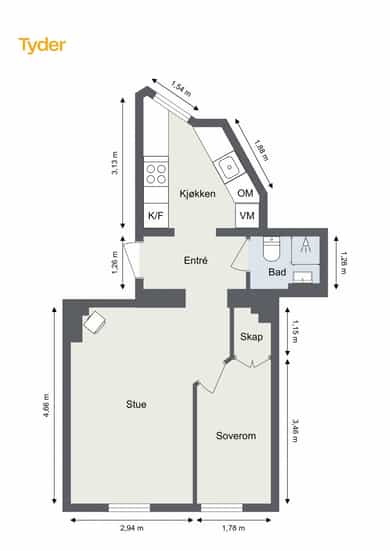 BRA-i: 37 kvm. Stue, kjøkken, bad, soverom og entré