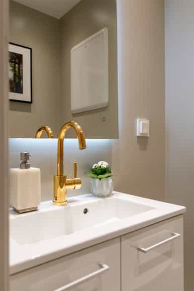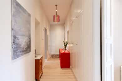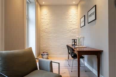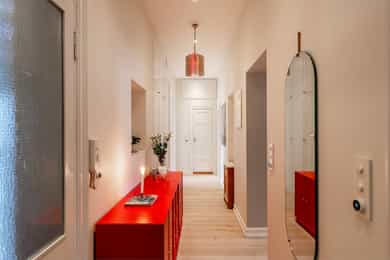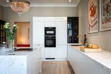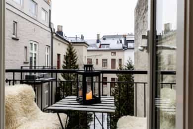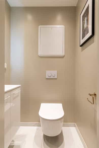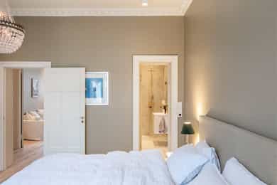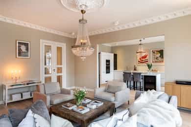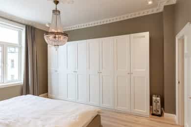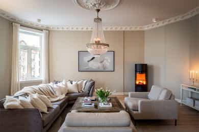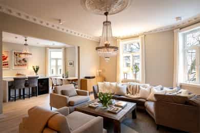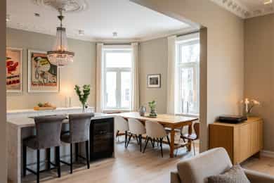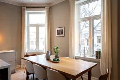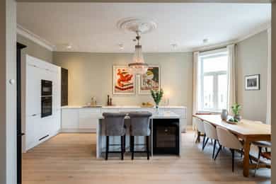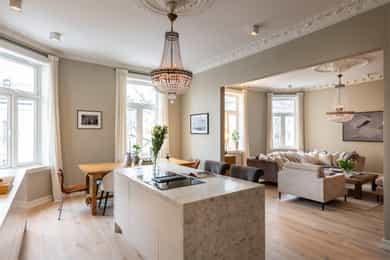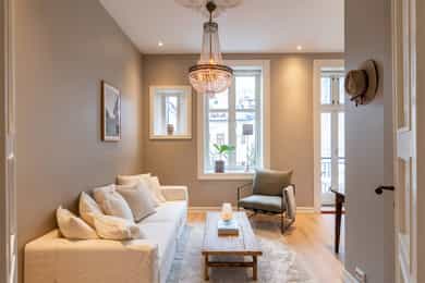 Leiligheten ble gjennomgående renovert i 2020 og fremstår med høy standard. Det er lagt eksklusiv 1-stavs parkett med varmefolie i samtlige rom, kombinert med elegante fløydører og store vindusflater som gir rikelig med naturlig lys. I forbindelse med oppussingen ble røropplegg fornyet, vinduer skiftet og det elektriske anlegget oppgradert med nytt ledningsnett, kontakter og brytere. Boligen ligger skjermet til i byggets tredje etasje og har en gjennomgående og romslig planløsning bestående av entré, stue, kjøkken med spiseplass, to soverom, flislagt bad samt separat gjestetoalett. Fra soverom II er det utgang til balkong mot rolig bakgård. Entré Lyst og innbydende inngangsparti som gir et godt førsteinntrykk. Plassbygget garderobeskap med profilerte fronter gir god oppbevaring av yttertøy og sko. Dekorativ innfelt hyllenisje i vegg. Downlights i himling og callinganlegg installert. Stue Meget romslig og innbydende stue med plass til stor sofagruppe og øvrig møblement. Delvis åpen løsning mot kjøkken skaper en sosial rominndeling samtidig som sonene får en naturlig inndeling. Moderne peisovn, gir god varme på kjølige dager. Takhøyden er målt til over 3 meter, med vakker stukkatur, rosett med lampeoppheng samt downlights i himling. Kjøkken Stort og funksjonelt kjøkken med innredning langs vegg og kjøkkenøy med barløsning. Kjøkken fra Epoq med hvite, slette fronter og benkeplate i kompositt med underlimt vask og ettgreps blandebatteri i messing fra Tapwell. Hjørneskap med glassfronter. Integrerte hvitevarer bestående av induksjonstopp med integrert kullfiltervifte, stekeovn, ovn med mikrofunkjson, oppvaskmaskin, kjøle- og fryseskap samt vinskap. God skap- og benkeplass. Plass til spisegruppe ved vindu med hyggelig utsyn. Stukkatur, rosett og downlights i himling. Soverom I Romslig hovedsoverom med plass til stor dobbeltseng og nattbord. Stort garderobeskap med profilerte dører gir rikelig med oppbevaringsplass. Stukkatur og rosett i himling. Direkte adkomst til bad. Soverom II / Bibliotek Koselig og lunt rom som er brukt som bibliotek. Rommet passer også godt som soverom med plass til dobbeltseng, nattbord og garderobeløsning. Dekorative innfelte hyllenisjer i vegg. Rosett med lampeoppheng og downlights i himling. Utgang til sydøstvendt balkong mot hyggelig bakgård, med gode solforhold på formiddagen. Alternativ planskisse og illustrasjoner hvor rommet er inndelt med kontordel følger vedlagt i salgsoppgaven. Bad Delikat og moderne flislagt bad med varmekabler i gulv. Badet er innredet med servant med underskuffer, vegghengt toalett med skjult sisterne og dusjhjørne med blandebatteri i messing, hånddusj og regnfallshode. Opplegg for vaskemaskin. Downlights i himling. Ventilasjon er mekanisk og opplyst fuktstyrt. Gjestetoalett Separat toalett med flislagt gulv og varmekabler. Innredet med servant med underskap, speil med integrert belysning og vegghengt toalett med skjult sisterne. Downlights i himling. Oppbevaring Stor kjellerbod som kan brukes til alt av oppbevaring. Den har også vært benyttet som treningsrom. Boden er ca. 22 m² og har god dør. I tillegg disponerer leiligheten en bod i trappeoppgangen (vaskerom) utenfor leiligheten, og en loftsbod.