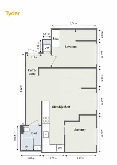 BRA-i: 49 kvm. Entré, Bad, Kott, Stue/kjøkken, To soverom