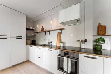 Leilighet i boligbygg fra 1892. Leiligheten holder en gjenommgående god standard, der tidsriktige farge- og materialvalg som gir et moderne og stilrent uttrykk. Det er gitt TG2 på visse punkter i leiligheten. Det er utarbeidet en tilstandsrapport for boligen som følger vedlagt i salgsoppgaven. Se tilstandsrapport eller spør megler for nærmere informasjon om tilstandsgrad og standard. Sammendrag av boligens tilstandsgrader: TG 0/1: 11 TG2: 7 TG3: Ingen TG IU: 1 __________________________ Kjøkken: Kjøkkenet er en stilren IKEA-innredning fra 2016 med glatte fronter og benkeplate i tre, utstyrt med nedfelt kum i rustfritt stål. Kjøkkenet har integrert stekeovn, platetopp, oppvaskmaskin og kjøl/frys, samt kullfilterventilator. For ekstra trygghet er det montert komfyrvakt og automatisk vannstopper. Bad: Lyst bad med flislagte overflater og elektriske varmekabler i gulv. Badet er ifølge eier pusset opp i 2016. Dokumentasjon på utførelse er ikke fremvist. Baderomsinnredning bestående av benkeskap med glatte fronter. Speil over servanten. Dusj med innfellbare dører i herdet glass, servant i helstøpt plate og veggfestet klosett med innebygget sisterne. Kott: Ifølge eier det etablert sluk, vanntett sjikt og fliser på gulvet, og opplegg for vaskemaskin. Dokumentasjon på utførelse er ikke fremvist. __________________________ Innvendige overflater: Gulv: Innvendige gulv er belagt med gulvbord. Fliser på bad. Vegger: Sparklet og malte overflater på plater/murpuss. Fliser på bad. Tak: Sparklet og malte plater Tekniske installasjoner: - Avløpsrør i plast. - Ledningsnett for vann i rør i rør systemer med fordelerstokker bak luke over himling på badet. - Leilighetens stoppekraner for varmt- og kaldtvann er montert på fordelerstokkene. - Friskluft via spalteventiler i vindu i ett soverom. - Friskluftsventil på yttervegg i stue og soverom. - Elektrisk/fuktstyrt avtrekksvifte på badet. - Luftespalte med lufttilførsel under dør mot badet. Elektriske anlegg: - Det elektriske anlegget ligger delvis skjult og åpent. - Sikringstavle med jordfeilautomater, montert i felles gang. Diverse: - Himlingshøyde ca. 2,51 m målt i stue/kjøkken. - Himlingshøyden er målt til ca. 0,80 m på det laveste punktet på skråvegger.