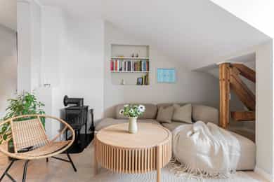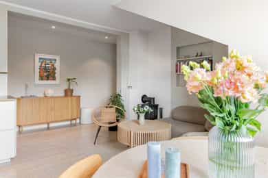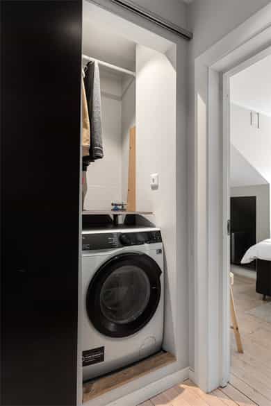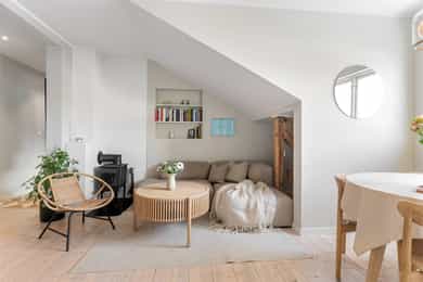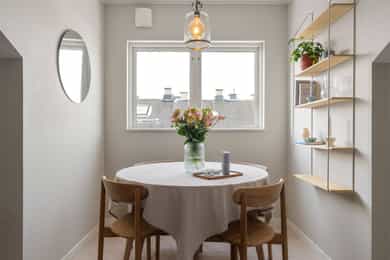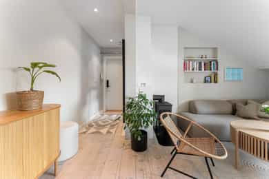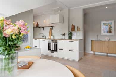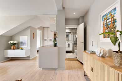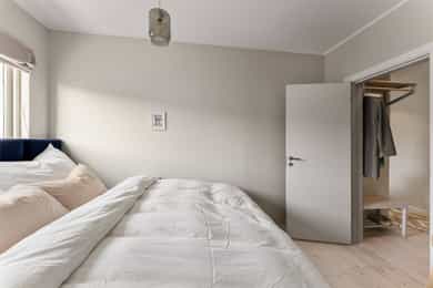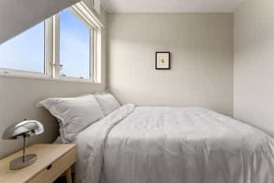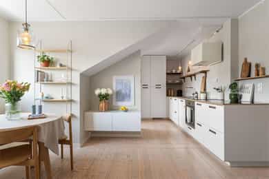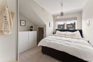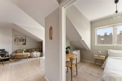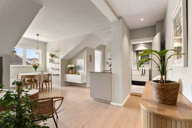 Dette er en lys og tiltalende loftsleilighet med en gjennomgående god planløsning og en luftig atmosfære. Leiligheten byr på to soverom og en romslig stue/spisestue i åpen løsning mot et delikat kjøkken. Den åpne planløsningen skaper et sosialt og hyggelig oppholdsrom med god flyt mellom sonene, perfekt både til hverdags og når man har gjester. Rause vindusflater slipper inn rikelig med natulig lys og gir boligen en lett og innbydende romfølelse. Videre har leiligheten et lyst og stilrent bad. I tillegg finnes et praktisk kott med opplegg for vaskemaskin, som gir ekstra oppbevaringsplass og en ryddig hverdag. Boligen holder en gjennomgående god standard, med tidsriktige farge- og materialvalg som gir et moderne og stilrent uttrykk. Dette er en sjarmerende loftsleilighet som kombinerer god arealutnyttelse, fine lysforhold og moderne uttrykk. Leiligheten disponerer gode oppbevaringsmuligheter i to eksterne boder på loftet, i samme etasje som leiligheten. Bodene har et gulvareal på henholdsvis ca. 3 m² og 3 m². Entré: Lys og romslig entré som gir et godt førsteinntrykk av leiligheten. Det er god plass til oppheng av yttertøy og praktisk oppbevaring. Stue/spisestue: Lys og romslig stue/spisestue i åpen løsning mot kjøkkenet. Planløsningen gir effektiv arealutnyttelse og skaper et hyggelig, sosialt oppholdsrom. Rommet har gode møbleringsmuligheter med plass til flere naturlige soner. Rause vindusflater slipper inn rikelig med dagslys og bidrar til en lun og trivelig atmosfære. Kjøkken: Delikat IKEA-kjøkken fra 2016 med lyse fronter og benkeplate i tre. Kjøkkenet er smart planlagt med fokus på funksjonalitet, og byr på rikelig med både benkeplass og oppbevaringsplass i skap. Hovedsoverom: Leilighetens hovedsoverom er av god størrelse, innredet med et stort garderobeskap. Det er ellers god plass til dobbeltseng, eller annet ønsket møblering. Det er inngang til en praktisk lagrinsluke. Soverom II: Leiligheten har en praktisk og familievennlig planløsning med to soverom. Soverom nummer to har god plass til seng, kommode og øvrig møblering etter behov, og egner seg utmerket som barnerom, gjesterom eller hjemmekontor. Bad: Lyst og stilrent bad fra 2016 med flislagte overflater og varmekabler i gulvet. Baderomsinnredningen består av lyst benkeskap med glatte fronter, samt speil plassert over servanten. Kott: Praktisk kott innredet med vaskemaskin - som gir ekstra oppbevaringsplass og en ryddig hverdag.