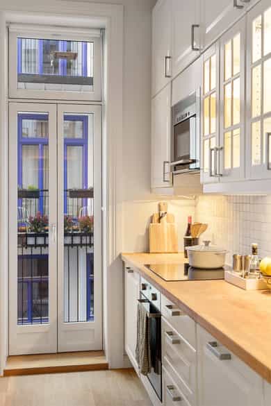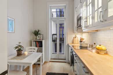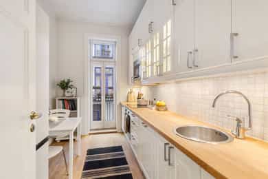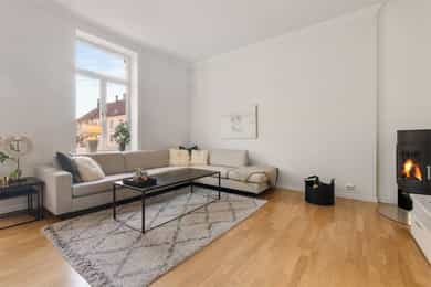 Entré: Velkommen inn! Her får du et lyst og godt førsteinntrykk. Det er godt med lagringsplass i åpen, innebygd garderobeløsning. Porttelefon og sikringsskap. Gangen har en sentral plassering som sikrer god flyt mellom alle rom. Kjøkken: Separat, klassisk og lyst kjøkken med spiseplass og utgang til balkong. Kjøkkeninnredning fra 2010 med profilerte fronter, flislagt på vegg over kjøkkenbenk og heltre benkeplate. Selger opplyser at benkeplaten nylig ble slipt og lakkert (desember 2025). Nedfelt oppvaskkum med ettgrepsblandebatteri fra Oras. Innredning med mekanisk avtrekksvifte over stekesonen. Det er integrert oppvaskmaskin, platetopp og stekeovn og frittstående kjøle-/fryseskap. Den gode takhøyden er utnyttet til det maksimale med ekstra overskap, så her er det godt med lagringsplass. Fra kjøkkenet er det utgang til en nordvestvendt balkong på ca. 3 kvm. Her er det plass til utemøblement og beplanting. Balkongen ble oppført i 2012, og vender mot hyggelig bakgård. Stue: Lys og innbydende stue av god størrelse. I stuen er det god plass til sofagruppe med tilhørende sofabord og tv-møblement og spisegruppe. Overflatene er velholdte, og består av tre-stavs eikeparkett og veggene er malt i lyse farger. Den gode takhøyden på over 3 meter og det gode lysinnslippet fra to store vindusflater gir en god romfølelse. Videre har stuen en velutformet planløsning som gjør innredningsjobben enkel. I hjørnet er det montert en moderne peis som gir behagelig, vedvarende varme og som også bidrar til hyggelig stemning på kalde høst- og vinterkvelder. Pipeløpet ble rehabilitert i regi av borettslaget i 2014 med innvendig stålrør. To soverom: Leiligheten har to soverom. Hovedsoverommet er romslig, og har god plass til dobbeltseng med tilhørende nattbord på hver side. Det er rikelig med oppbevaringsplass i garderobeløsning montert langs den ene veggen. På soverommet er det overflater med malt tregulv og tapet på den ene veggen. Soverommet har stort vindu som sikrer godt med lys og luft, og vender mot bakgård. Soverom 2 passer godt som barnerom, gjesterom eller hjemmekontor. Rommet har plass til seng, skrivepult og skap. Soverommet er i dag innredet og brukt som ekstra stue. Bad: Flott, flislagt bad som utvidet og renovert i 2010 (ifølge tidligere salgsoppgave). Badet har flislagte overflater, behagelig gulvvarme og downlights i himling. Rommet er utstyrt med veggmontert toalett, dusjhjørne med innfellbare glassdører og baderomsinnredning med skuffer, speil og dobbel servant hvor begge har ettgrepsblandebatteri fra Tapwell. Det er opplegg for vaskemaskin i vaskesøyle. Ventilasjon med mekanisk avtrekk. Overflater: Gulv: Tre-stavs eikeparkett, malt overflate på gulv og fliser på badet. Vegger: Malt overflate på vegger og flislagte vegger på badet. Himling: Malt himling. På kjøkkenet ble takhøyden oppmålt til 3,11 meter.