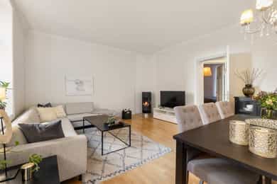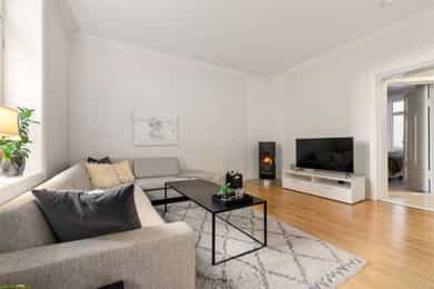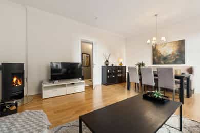 Lys og gjennomgående 3-roms med balkong - Stukkatur og peis - Varmtvann inkl - Rolig gate med parken som nærmeste nabo