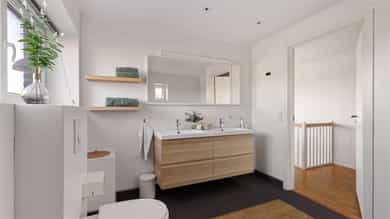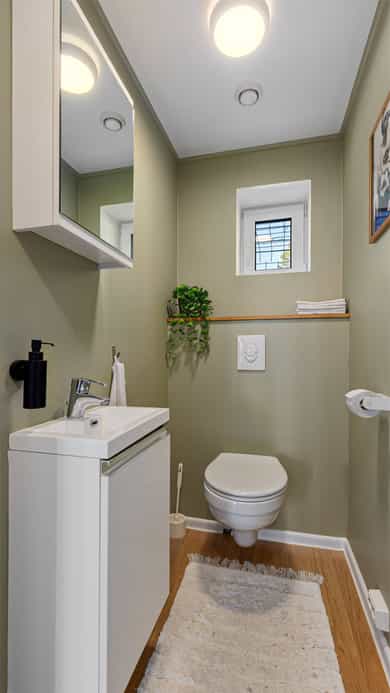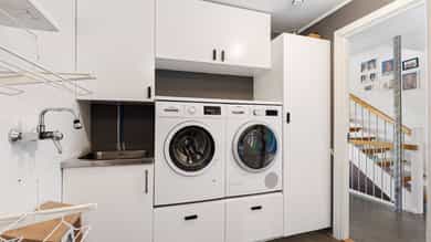 Underetasje: Leilighet Vindfang Velkommen inn til en hyggelig gang med plass for klær og sko. Soverom Leiligheten har 2 soverom med plass for seng og oppbevaring. Stue og kjøkken Det er i dag åpen stue og kjøkken løsning. Store vindusflater gir en åpen og fin atmosfære. Lyst kjøkken med slette fronter og integrerte hvitevarer. Bad her er det fliser fra gult til tak. Himling er med malt gips og ventil i himlingen. Innredning med vask, klosett, dusjhjørne og avløp til vaskemaskin. Bod Praktisk bod for oppbevaring. Tilhører eneboligens hoveddel Teknisk rom og med plass for oppbevaring. 1. etasje: Gang Velkommen inn til en romslig gang med plass til klær og sko. Vaskerom Gulvet er med støpt betong og veggene er med malte plater Himling er med malt gips og ventil i himling. Innredning med plass til vaskemaskin og tørketrommel. Her er det også plass til oppbevaring. WC På vaskerommet er det ett eget toalett. Her er det parkett på gulv og malte plater på veggene. Himling er med malt gips og ventil montert i himling. Innredning med servant med vask og toalett. Stue og kjøkken Det er i åpen stue og kjøkken løsning - som gir ett åpent og fin atmosfære. Store vindusflater slipper inn mye naturlig lys. Lekkert kjøkken med slette fronter og integrerte hvitevarer. Flott og praktisk kjøkken øy gir rom oppbevaring og en hyggelig sitteplass for 2. Her er det plass til både spisegruppe, sofagruppe og TV-møbler. Soverom Opprinnelig bod er i dag i bruk som soverom. 2. etasje: Stue I husets toppetasje finnes det en ekstra stue med utgang til to flotte takterrasser. Bad Her er det fliser på gulv og veggene er med plater og noe fliser. Himling er med malt gips og det er ventil i himling. Innredning med 2 servanter, vegghengt klosett, kar og dusjløsning. Soverom Etasjen byr på 2 soverom, begge med god plass til seng og oppbevaring. Diverse: Varmtvannsbereder montert i teknisk rom, er for begge boenhetene. Vannbåren varme i gulv til alle etasjer, er med energibrønn Ventilasjonsanlegg montert