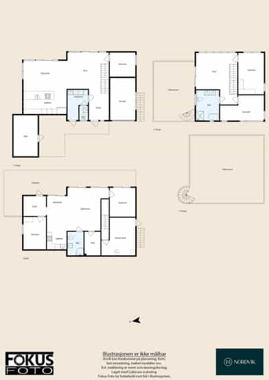 Underetasje: Vindfang, 2 soverom, stue, kjøkken, bad, bod og teknisk rom 1. etasje: Gang, vaskerom, WC, stue, kjøkken og soverom 2. etasje: Stue, bad og 2 soverom