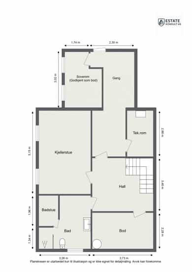 BRA-i: 78 kvm. Bad, soverom, hall, teknisk rom, bod, kjellerstue, gang og badstue