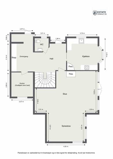 BRA-i: 105 kvm. Wc, entré/gang, hall, kjøkken, stue, spisestue og kontor