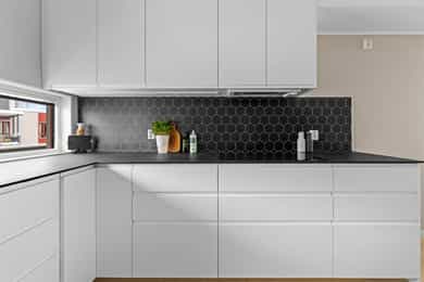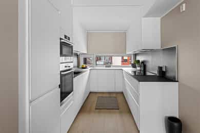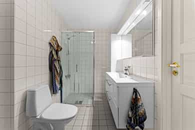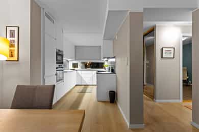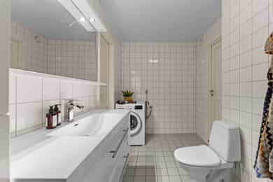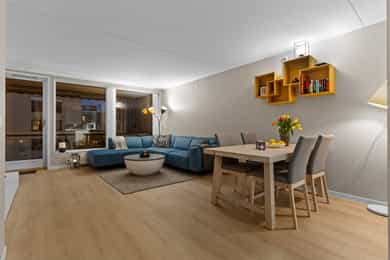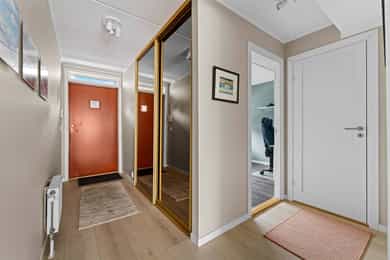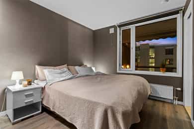 Entré: Velkommen inn i en romslig og funksjonell leilighet, utmerket for både nyetablerte og deg som ønsker å bytte ut huset med noe lettere. Leiligheten ligger i 3. etasje, og har enkel adkomst via en felles oppgang med heis. Det er en utvendig svalgang i etasjen, noe som gir leiligheten en gjennomgående planløsning med mye naturlig lys. Vel inne har entreen en plassbygd skyvedørsgarderobe med speilfronter for ekstra romfølelse. Et nytt 1-stavs laminatgulv fortsetter inn i stuen, og tilknyttet entreen finner man en hendig bod i bruk som walk-in closet. Stue: Entreen glir sømløst over i en stor, pen og innbydende stue, der endeveggen er dekket med vinduer som slipper inn rikelig med dagslys. Vinduene inkluderer en glassdør til balkongen, en herlig romforlengelse i sommerhalvåret. Sammen med kjøkkenet utgjør stuen et åpent og sosialt allrom med klart avdelte soner. Romløsningen gir fint gjennomlys, og laminatgulvet kombineres med vegger malt i en delikat gråtone. Utformingen gjør stuen enkel å møblere, og nærmest kjøkkenet passer det utmerket å innrede med spisebord. Kjøkken: Kjøkkenet er stilrent og moderne, oppført i en smart u-form med god skap- og benkeplass. Innredningen ble montert i 2021, med hvite, glatte fronter, sort benkeplate og nedfelt oppvaskkum. Over kokesonen er en ventilator etablert, og over deler av benken har kjøkkenet belysning og sorte plater i heksagonmønster. Alle hvitevarene er integrerte; stekeovn, platetopp, kombiovn, oppvaskmaskin og kombinert kjøl/frys. Begge ovnene er praktisk plassert i et høyskap. Bad og vaskerom: Badet er tilknyttet hovedsoverommet, men har også adkomst fra entreen. Løsningen gir god funksjonalitet, og badet er innredet med beige veggfliser og lysegrå gulvfliser. Opplegg for vaskemaskin er etablert, og badet har toalett, varmekabler og dushjørne med innfellbare dører. Baderomsinnredningen er tidløs, bestående av en servant med hvite skuffer, et matchende høyskap og et stort speil med belysning. Skapene gir god plass til oppbevaring av håndklær og hygieneartikler. Soverom: I leiligheten er det to gode soverom holdt i tidsriktige farger, og på gulvet er det lagt et nytt 1-stavs laminatgulv i mørk utførelse. Hovedsoverommet ligger i suiteløsning med badet, og har god oppbevaring i en plassbygd skyvedørsgarderobe med speilfronter. På det andre soverommet er et hvitt garderobeskap plassert i egen nisje. Også entreen har skyvedørsgarderobe, og ekstra lagringsplass finnes i boden ved entreen, i boden på balkongen og i en disponibel kjellerbod som måler ca. 5 kvm.
