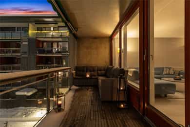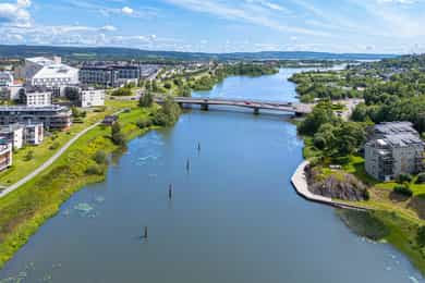 Fellesområdet er pent opparbeidet med store grøntarealer, koselige sittegrupper og diverse beplantning. Leiligheten ligger i 3. etasje, der stuen har utgang til en overbygd balkong på ca. 12 kvm. Belysning er montert, og balkongen har stor markise, hendig bod og fint utsyn mot elva. Uterommet oppleves skjermet, og det er god plass til en stor sittegruppe for både rolige og sosiale kvelder.