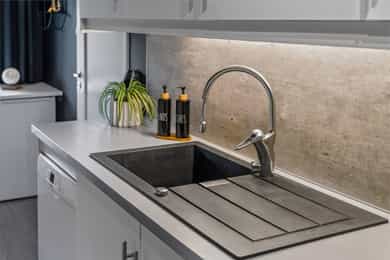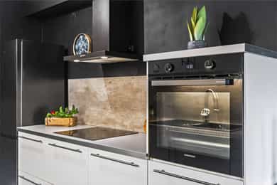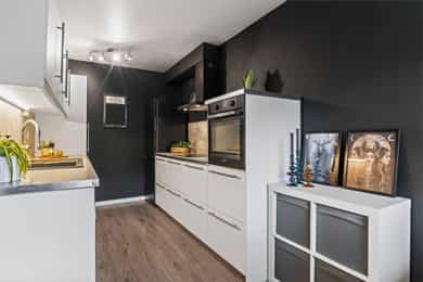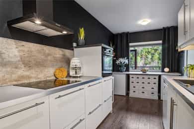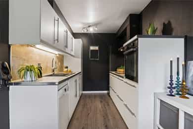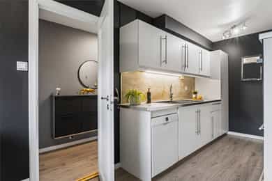 Integrerte hvitevarer medfølger. Kjøleskap medfølger ikke.