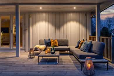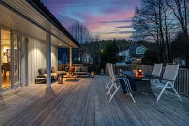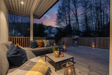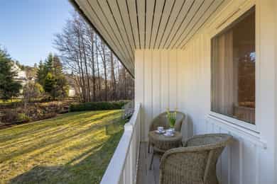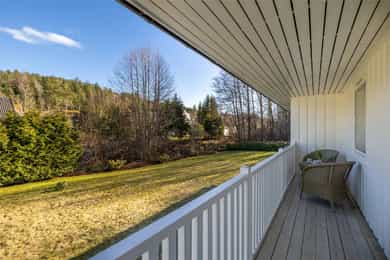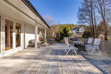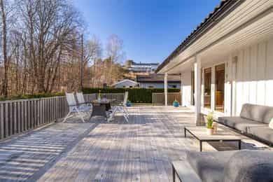 Fra stuen i første etasje er det utgang til en stor veranda med nye terrassebord fra 2015. Verandaen er delvis overbygd og har god plass til flere sittegrupper, grill og hyggelig beplantning. Terrassen er pent innrammet med rekkverk og det er åpning og trapp ned til hagen. I tillegg er det utgang fra hovedsoverommet til en overbygd luftebalkong.