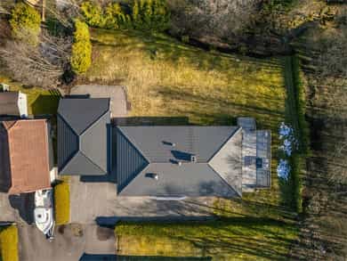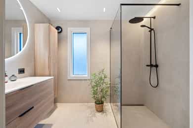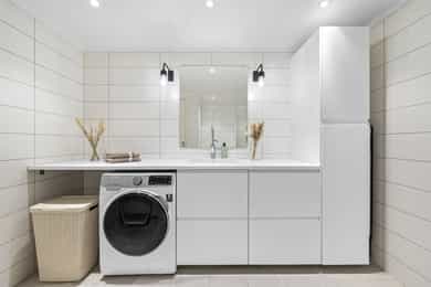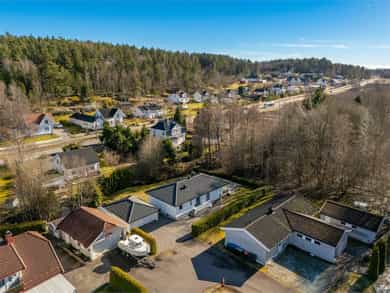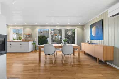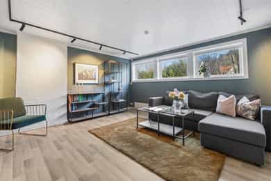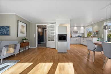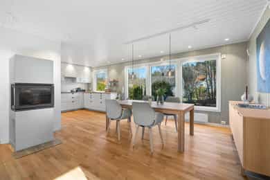 Planløsning: 1. etasje: Entré, wc-rom, bad, 3 soverom og stue/kjøkken i åpen løsning. Kjelleretasje m/hybel: Trapperom, kjellerstue, bad/vaskerom, bad, gang, soverom, kjøkken, stue. Kort fortalt: - Velholdt familiebolig fra 1980. - Stor, skjermet tomt på ett mål med grense mot friareal i den ene enden. - Romslig hage og stor veranda med gode solforhold. - Parkering i dobbel garasje og i eget gårdsrom. - Boligen har hybel i kjelleretasje. - Stue/kjøkken i åpen løsning. - Peisovn og varmepumpe. - Stilrent kjøkken fra 2015 med integrerte hvitevarer. - Fin kjellerstue med varmepumpe. - Tre fine soverom, to med skap i tillegg til soverom i hybelen. - Tre pene bad, to i hovedboligen. - Badene er fra 2009, 2016 og 2024. - El-anlegg med automatsikringer.