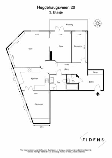 På bakgrunn av utformingen av planet og manglende fri siktelinje mellom yttervegger kan det ikke utelukkes større avvik enn 2%. For mer nøyaktig oppmåling anbefales det utført 3D-scan.
