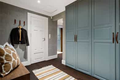 Stue 1: Parkett på gulv, og malt overflate og tapet på vegger. Malt overflate i himling. Panelovn og peis. Stue 2: Parkett på gulv, og malt overflate og tapet på vegger. Malt overflate i himling. Utgang til balkong. Kjøkken: Parkett på gulv og malt overflate på vegger. Downlights og malt overflate i himling. Innredning med mekanisk avtrekksvifte over stekesonen. Det er integrert mikroovn, platetopp, stekovn og oppvaskmaskin. Soverom 1: Parkett på gulv, tapet på vegger, malt overflate himling, panelovn, plassbygget/innebygget garderobe. Soverom 2: Parkett på gulv og malt overflate på vegger. Malt overflate i himling. Panelovn. Garderobeskap. Bad: Flis på gulv, og flis og malt overflate på vegger. Downlights og malt overflate i himling. Gulvvarme. Utstyrt med badekar, innfellbare dusjdører, mekanisk avtrekk, opplegg for vaskemaskin, servantskap og veggmontert wc. Toalett: Flis på gulv og malt overflate på vegger. Malt overflate og downlights i himling. Gulvvarme. Utstyrt med veggmontert wc og servantskap. Entre: Parkett på gulv, og malt overflate og tapet på vegger. Downlights og malt overflate i himling. Garderobeskap og porttelefon. Bygningsdeler med TG2: Vinduer og dører: TG2 pga alder på vinduer, enkelte vinduer tar i karm samt manglende brannmerking på entredør. Etasjeskille og gulv på grunn: TG2 pga skjevheter. Ildsted/Skorstein innvendig i boligen: TG2 pga alder på pipeløp Toalettrom: TG2 pga det er ikke etablert noen drensåpning for synliggjøring av lekkasje fra innebygd sisterne, og det er ikke framlagt noen dokumentasjon på annen godkjent løsning. Våtrom - Overflater: TG2 pga fallforhold på gulv, misfarget siliconefug i dusjen samt enkelte flis er sprukket. Våtrom - Membran, tettesjikt og sluk: TG2 pga alder på tettesjikt. Våtrom - Sanitærutstyr: TG2: Det er ikke etablert noen drensåpning for synliggjøring av eventuell lekkasje fra innebygget sisterne, og det er ikke framlagt noen dokumentasjon på annen godkjent løsning. Bygningsdeler med TG-IU: Elektrisk: TGIU pga i tråd med veileder fra Direktoratet for byggkvalitet settes det ikke tilstandsgrad på bygningsdelen (elektrisk anlegg). Varmtvannsbereder: Det er felles opplegg for varmtvann. Varmtvannsberedere er plassert i kjeller og tilhører sameiet. Disse er derfor ikke vurdert i denne rapporten. Våtrom: Det er ikke mulig å foreta hulltaking i tilstøtende rom direkte mot dusjsonen. Kjøkken hindrer dette.