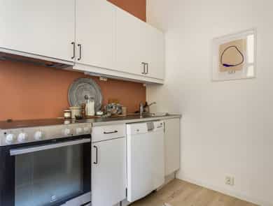 Entré - Velkommen hjem! Entréen ønsker deg velkommen med god plass til å henge fra seg yttertøy og sko. En ryddig og funksjonell entré som gir et godt førsteinntrykk. De lyse, delikate fargetonene setter tonen for resten av leiligheten og skaper en harmonisk atmosfære. Stue: Den lyse og innbydende stuen byr på en gjennomført planløsning med god plass til både sofagruppe, spisebord og øvrig møblement. Store vindusflater slipper inn rikelig med naturlig lys og skaper en luftig og åpen romfølelse som virkelig løfter helhetsinntrykket. Rommet er malt i en delikat, moderne fargetone som harmonerer flott med den stilrene parketten på gulvet. Kjøkken: Kjøkkenet ligger i åpen løsning mot stuen og er utformet med fokus på både funksjonalitet og stil. Her får du godt med skap- og benkeplass, samt en moderne innredning fra Sigdal med hvite fronter og laminert benkeplate. En sosial kjøkkenøy med barløsning gjør det enkelt å underholde gjester under matlagingen. Det er tilrettelagt for frittstående hvitevarer og oppvaskmaskin. Over stekesonen sørger mekanisk avtrekk for godt inneklima. Et kjøkken som innbyr til både matlaging og sosialt samvær! Bad: Badet er fra 2014 og har tidløse fliser, behagelig gulvvarme og downlights i taket. Det er innredet med nedfelt servant med underskap, speil, vegghengt toalett og dusjplass med inn- og utadslående dusjvegger. I tillegg er det opplegg for vaskemaskin og tørketrommel samt mekanisk avtrekk - alt lagt til rette for en enkel og komfortabel hverdag. Soverom: Romslig soverom med god plass til dobbeltseng og tilhørende møbler. Det er også plass til garderobeskap, som gir gode oppbevaringsmuligheter. Den nøytrale stilen gjør det enkelt å tilpasse rommet etter egne behov. Innvendig overflater: - Gulv: Parkett i alle rom. - Vegger: Malte flater i alle rom. - Tak: Malte flater i alle rom. - Takhøyde i stue på 2,87 m.