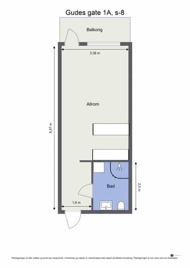 Boligen inneholder i dagens løsning: 3. etasje: Entré, bad og stue/kjøkken/allrom. Øvrige arealer - Balkong 5 kvm. - Bod i fellesareal på 5 kvm.