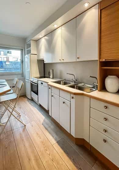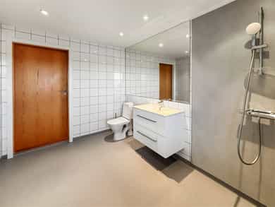 Kjøkken: Kjøkkeninnredning med laminerte skrog, glatte fronter og benkeplate er laminert. Laminat over benkeplate. Kjøkkenvifte med omluft og dobbel kjøkkenkum. Plass til frittstående komfyr, oppvaskmaskin og kjøleskap. Bad: Badet har gulvbelegg, fliser på vegg og våtromsplater på vegg. Malte plater i himling. Innredet med servant med underskap, speil, dusjdører, dusj og gulvmontert toalett. Badet har ventilasjonsvifte, tilluft i dør, varme i gulv og plastsluk. Toalettrom: Toalettrommet har gulvmontert wc, servant, speil, ventil og tilluft i dør. Det er belegg på gulv, murpuss på vegg, malte plater på vegg og plater i himling. Innvendige overflater: Gulv: Parkett, belegg og laminat. Vegger: Malte plater, fliser og våtromsplater. Himling: Malte plater. Etasjeskiller: Etasjeskiller i betong. Innvendige dører: Tredører. Tekniske installasjoner: Synlige vannrør i: Plast og metall. Synlige avløpsrør i: Plast og støpejern. Ventilasjon: Ventilasjonen består av ventilasjonsvifte og naturlig avtrekk. Frisk tilluft blir tilført gjennom ventiler eller gjennom aktiv lufting med vinduer. Brukt luft suges ut av ventilasjonsvifte eller naturlig oppdrift. Elektrisk anlegg: El-anlegg med automatsikringer. Åpent og skjult ledningsnett. Det er i forbindelse med salget utarbeidet en tilstandsrapport fra bygningssakkyndig. Tilstandsrapporten er en teknisk gjennomgang av boligen med oppdagede avvik. Forhold som har fått TG2 og TG3 må gjennomgås spesielt nøye, da disse indikerer avvik fra normal slitasje og/eller høy alder, med mulig behov for utbedring. Bygningsdeler som har fått TGIU er ikke undersøkt av takstmann. Bygningsdeler som har fått TG2: - Taktekking: Taktekkingen er besiktiget fra bakkenivå og innvendig i bolig da det ikke var godkjent sikringsutstyr for arbeid på tak på befaringen. Det tas spesifikt forbehold om at deler av denne bygningsdelen er skjult, har en alder som øker sannsynligheten for skjulte feil og har brukt opp mye av sin forventede brukstid. Tilstandsgrad gitt pga. nevnte forhold. - Veggkonstruksjon: Eksakt tilstand kan ikke sjekkes uten bygningsmessige inngrep. Gjenstående arbeid. Det tas spesifikt forbehold om at deler av bygningsdelen er skjult, har en alder som øker sannsynligheten for skjulte feil og har brukt opp mye av sin forventede brukstid. Tilstandsgrad gitt pga. nevnte forhold. - Takkonstruksjon/Loft: Eksakt tilstand kan ikke sjekkes uten bygningsmessige inngrep. Takkonstruksjonen er i hovedsak lukket og inspeksjonsmuligheten er derfor begrenset. Det tas spesifikt forbehold om at deler av bygningsdelen er skjult, har en alder som øker sannsynligheten for skjulte feil og har brukt opp mye av sin forventede brukstid. Flat takkonstruksjon er innkledd på begge sider og derfor ikke tilgjengelig for inspeksjon. Denne type tak er en risikokonstruksjon, det vil si en konstruksjon som erfaringsmessig har høy skadefrekvens. Tilstandsgrad gitt pga. nevnte forhold. - Vinduer: Det er påvist tegn på innvendig kondensering av enkelte vindusglass. Gjenstående arbeid utvendig. Tilstandsgrad gitt pga. nevnte forhold. - Utvendige dører: Løs pakning i vindu på hovedytterdør. Tilstandsgrad gitt pga. nevnte forhold. - Balkonger, terrasser og rom under balkonger: Altanen over boligrom regnes som en risikokonstruksjon, da erfaring viser at slike konstruksjoner ofte har hyppige skadefrekvenser, spesielt knyttet til fuktinntrengning og skjulte skader i konstruksjonen. Det tas spesifikt forbehold om at deler av bygningsdelen er skjult, har en alder som øker sannsynligheten for skjulte feil og har brukt opp mye av sin forventede brukstid. Behov for vedlikehold. Tilstandsgrad gitt pga. nevnte forhold. - Andre utvendige forhold: Det er ikke utarbeidet Tilstandsanalyserapport, vedlikeholdsplan e.l. for fellesdeler i bygget. Tilstandsgrad gitt pga. nevnte forhold. - Innvendige overflater: Observert kul på gulv på soverom. Ved bruk av fuktindikator registrerte jeg unormale verdier. Lagrede gjenstander begrenset inspeksjonsmuligheten i toalettrom. Tilstandsgrad gis pga. nevnte forhold. - Etasjeskille/gulv mot grunn: Det tas spesifikt forbehold om at deler av denne bygningsdelen er skjult, har en alder som øker sannsynligheten for skjulte feil og har brukt opp mye av sin forventede brukstid. Tilstandsgrad gis pga. nevnte forhold. - Radon: Det er ikke foretatt radonmålinger, og bygget er heller ikke utført med radonsperre. Eiendommen ligger i et området som er markert med moderat til lav aktsomhet i kartet. Tilstandsgrad gitt pga. nevnte forhold. - Pipe og ildsted: Det tas spesifikt forbehold om at deler av bygningsdelen er skjult, har en alder som øker sannsynligheten for skjulte feil og har brukt opp mye av sin forventede brukstid. Tilstandsgrad gitt pga. nevnte forhold. - Innvendige dører: Det er påvist avvik som tilsier at det bør foretas tiltak på enkelte dører. Slark i enkelte dørvridere. Tilstandsgrad gitt pga. nevnte forhold. - Vannledninger: Det tas spesifikt forbehold om at deler av denne bygningsdelen er skjult, har en alder som øker sannsynligheten for skjulte feil og har brukt opp mye av sin forventede brukstid. Tilstandsgrad gitt pga. nevnte forhold. - Avløpsrør: Rust/tæring på støpejernsrør. Eldre rør kan være utsatt for rust/groing og gi redusert gjennomstrømning/risiko for lekkasjer. Alder er normalt i seg selv en vurderingskriterie hva angår slitasjegrad. Det tas spesifikt forbehold om at deler av bygningsdelen er skjult, har en alder som øker sannsynligheten for skjulte feil og har brukt opp mye av sin forventede brukstid. Tilstandsgrad gitt pga. nevnte forhold. - Ventilasjon: Kondens på innerrutas innside i vinduer med mer enn ett glass skyldes hovedsakelig høy luftfuktighet innendørs, og er ofte et tegn på at ventilasjonen er dårlig eller fuktproduksjonen høy. Ventilasjonen i en bolig skal sikre tilfredsstillende luftkvalitet for brukerne med hensyn til helse og komfort og begrense luftfuktigheten innendø