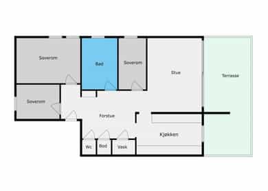 BRA-i: 86 kvm. Bad, kjøkken, bod, bod bebyttet som vaskerom, toalettrom og 3 soverom.