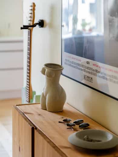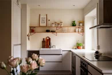 Entré: Entréen ønsker deg velkommen med god plass til å henge fra seg yttertøy og sko. Entréen er malt i en lys farge, og gulvet er dekket med sjarmerende tregulv som går igjen i hele boligen. En ryddig og funksjonell entré som gir et godt førsteinntrykk. Stue: Den lyse og hyggelige stuen har en fin planløsning hvor møblene har sin naturlige plass. Det er plass til sofa, spisebord og annet ønsket møblement. Store vindusflater sikrer gode lysforhold. Overflatene er hvitmalte, og det sjarmerende tregulvet gir rommet et ekstra særpreg. Fra stuen er det utgang til en flott østvendt balkong på ca. 6 m², med plass til ulike utemøbler. Balkongen ligger vendt mot en rolig bakgård. Kjøkken: Kjøkkenet ligger i en åpen og sosial løsning mot stuen, noe som skaper et trivelig oppholdsrom. Kjøkkenet har en funksjonell og praktisk utforming med rikelig skap- og benkeplass. Innredningen består av glatte fronter og laminert benkeplate med nedfelt vask. Kjøkkenet er utstyrt med platetopp, kjøleskuffer, stekeovn og oppvaskmaskin. Over stekesonen er det ventilator med kullfilter. Bad: Badet har tidløse, flislagte overflater, sisternekasse med mikrosement og elektrisk gulvvarme. Badet er innredet med servant, speilskap, vegghengt toalett og dusjhjørne med svingbare glassdører. Rommet har naturlig ventilasjon. Soverom 1: Romslig hovedsoverom med god plass til dobbeltseng, nattbord og garderobeskap. Rommet er malt i en nydelig blåtone, og gulvet er dekket med malt tregulv. Dype vinduskarmer gjør det enkelt å plassere pynt og planter. Oppvarming skjer via vegghengt radiator under vinduet. Soverom 2: Lyst og allsidig rom med plass til seng og tilhørende møbler. Enten du trenger gjesteværelse, barnerom eller kontor, er mulighetene mange. Innvendig overflater: Himlinger med malte plater og malt betong. Vegger med malt betong og malte plater. Gulv med originalt heltregulv. Takhøyden i stuen ble målt til: 2,62 m.