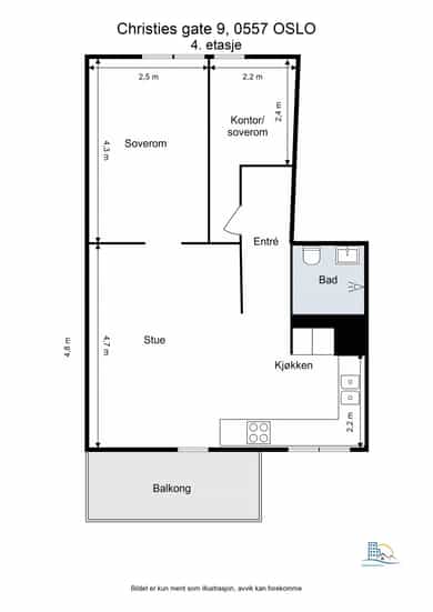 BRA-i: 50 kvm. Entré, stue/kjøkken bad, soverom og kontor/soverom.