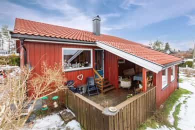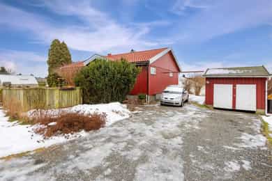 Enebolig på solrik hjørnetomt på 940 m² - Hage, terrasse og garasje - Barnevennlig og rolig område - Oppgraderingsbehov