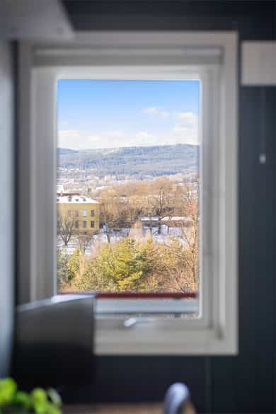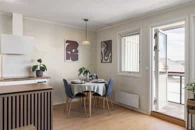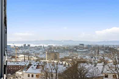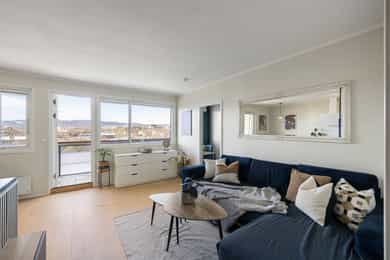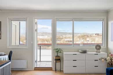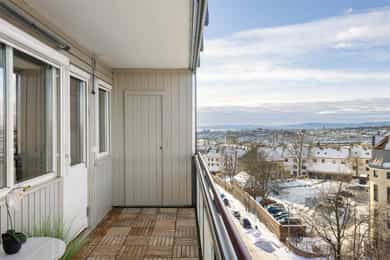En lys og høytliggende leilighet med skjermet beliggenhet på Rosenhoff. Boligen ligger i byggets 8. etasje og har en fri og luftig plassering uten innsyn, noe som gir en rolig og privat atmosfære. Planløsningen oppleves moderne og funksjonell med delvis åpen løsning mellom stue og kjøkken, som naturlig deler opp rommene i ulike soner. Fra stuen er det utgang til en romslig, innglasset balkong på ca. 9 m². Her kan kveldssolen nytes i rolige omgivelser samtidig som du har utsikt utover byen. Den høye og frie beliggenheten gir en luftig romfølelse og et utsyn som virkelig må oppleves! Kort fortalt: