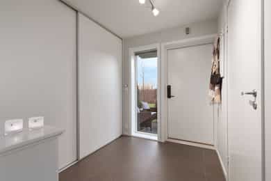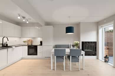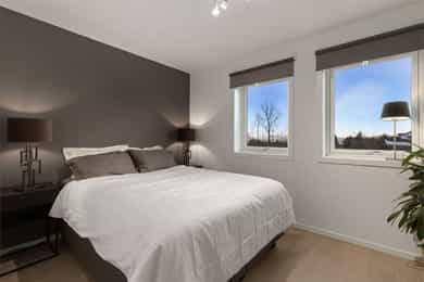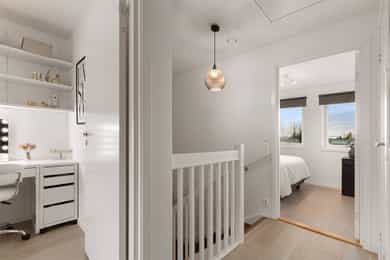 FØRSTE ETASJE Etasjen inneholder entré/gang, stue, kjøkken, bad/vaskerom samt kott/bod. Entré/gang har god plass til oppbevaring med skyvedørsgarderobe og sikringsskap, det er også har gulvvarme og spotlight i taket. Stuen fremstår lys og romslig med store vindusflater som gir rikelig med naturlig lys. Planløsningen gir en naturlig inndeling mellom stue- og spisestuedel. Det er installert gasspeis som gir effektiv oppvarming. Fra stuen er det utgang til en syd-vestvendt markterrasse på ca. 35 kvm med gode solforhold og plass til både spisegruppe og sosiale soner. Kjøkkenet er innredet med et tidløst Signal-kjøkken fra byggeår (2016) med hvite, glatte fronter. Benkeplaten er en keramisk benkeplate med nedfelt sort vask og sort armatur. Det er flislagt mellom benkeplate og overskap. Kjøkkenet er utstyrt med integrert oppvaskmaskin, komfyr og induksjonstopp, samt komfyrvakt og aquastopp. Bad/vaskerommet er innredet med laminat benkeplate, servantskap med nedfelt servant, innmurt speil, vegghengt toalett med innebygd sisterne samt dusjhjørne med innfelte dusjvegger i herdet glass. Det er opplegg for vaskemaskin og tørketrommel. Rommet har åpen rørfordeling i himling over dusjsonen, varmekabler i gulv og folierte stålplater i himling med downlights. Kott/bod benyttes til tekniske installasjoner og lagring, med varmtvannsbereder, ekspansjonstank, vannmåler og stoppekran plassert her. Overflater Gulv: Flis med gulvvarme i entré/gang og parkett i stue og kjøkken / flis med varmekabler på bad/vaskerom / belegg i kott. Vegger: Malte overflater / flis på bad/vaskerom. Himling: Malt og nedsenket himling med downlights / folierte stålplater med downlights på bad/vaskerom. ANDRE ETASJE Etasjen inneholder gang, baderom og tre soverom. Gangen har trappeforbindelse mellom etasjene samt takluke med adkomst til kaldloft. Hovedsoverommet fremstår romslig og har tilknyttet walk-in-closet med åpen garderobeløsning. Det er også god plass til kontorplass/hjemmekontor. De øvrige to soverommene egner seg godt som barnerom, gjesterom eller kontor. Alle soverom har panelovner. Baderommet er innredet med servantskap og servant, innmurt speil, vegghengt toalett med innebygd sisterne samt dusjnisje med innfelte dusjdører i herdet glass. Overflater Gulv: Parkett i gang og soverom / flis med varmekabler på baderom. Vegger: Malte overflater / flis på baderom. Himling: Malt himling med downlights / folierte stålplater med downlights på baderom.