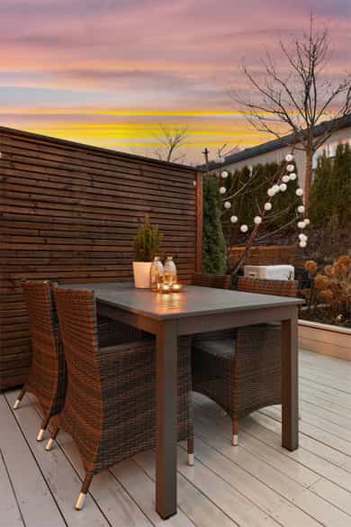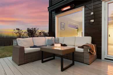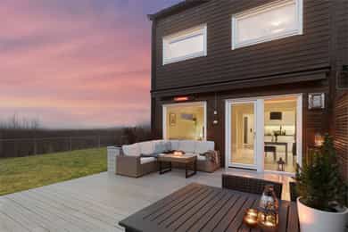 Boligen har en romslig, syd-vestvendt markterrasse på ca. 35 kvm med direkte utgang fra stuen. Terrassen er tilrettelagt for både spiseplass og sosiale soner, og byr på svært gode solforhold gjennom store deler av dagen. Det er montert motorisert markise, utelys, stikkontakter og varmelampe, noe som gir økt komfort og lang brukstid.