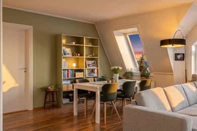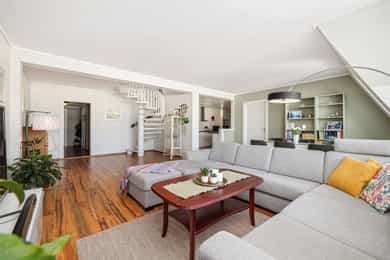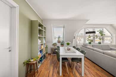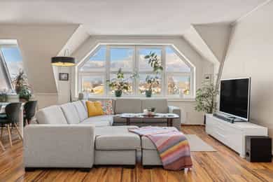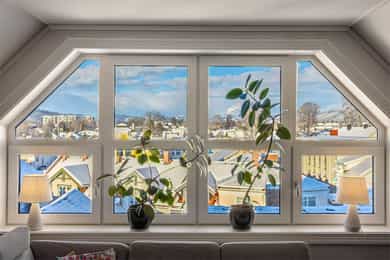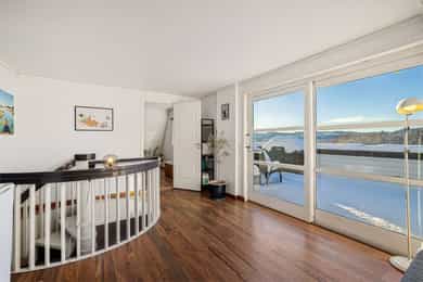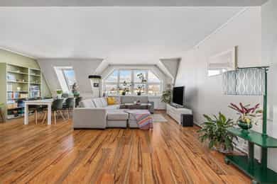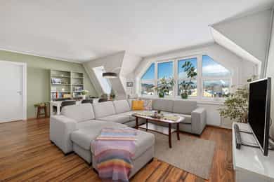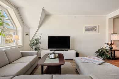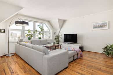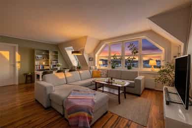 Innbydende og særpreget toppleilighet over to plan. 3 sov. Heis. Nydelig panoramautsikt fra stor vestvendt takterrasse!