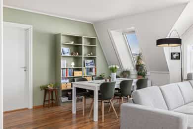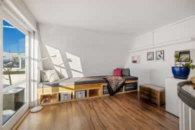 Denne lekre leiligheten fremstår som svært innbydende og attraktiv med areal over to etasjer. Leiligheten har en åpen og luftig planløsning, som gir god romfølelse og enkle møbleringsalternativ. Store vindusflater slipper inn godt med naturlig dagslys. Fra entré med plassbygget skyvedørsgarderobe er det videre inngang til stor stue/spisestue og kjøkken, samt 2 soverom, bad, toalettrom og vaskerom. Stuen har flott og romslig planløsning med god plass til flere sittegrupper. Spisestuen ligger i tilknytning til kjøkken og det er god plass til langbord. Fra stuen er det oppgang, via vindeltrapp, til loftsetasjen. Fra spisestuen er det delvis åpen løsning mot kjøkkenet. Pen kjøkkeninnredning fra Ikea, ny i 2014, med lett profilerte fronter på over- og underskap. Innredningen har praktiske løsninger og meget god oppbevaringsplass i innredning, samt rikelig med arbeidsplass på benkeflater. Integrerte hvitevarer som medfølger: stekeovn, platetopp, oppvaskmaskin og kjøleskap. Leiligheten har et romslig baderom, vaskerom og separat toalettrom. Baderommet har flislagte vegger og gulv, med varmekabler. Baderomsinnredning med skuffer og skap, samt overliggende servant. Tilhørende speil og veggskap med oppbevaringsplass. Dusjkabinett og gulvstående toalett. Baderommet har fått TG3 og må oppgraderes for å tåle normal bruk etter dagens krav. Praktisk toalettrom i tilknytning til entrè, innredet med servant og gulvstående toalett. Vaskerom med opplegg for vaskemaskin og tørketrommel. I denne hyggelige leiligheten er det tre gode soverom, fordelt med 2 soverom i hovedetasje og 1 soverom i loftsetasjen. Hovedsoverom har god plass til dobbeltseng, og er innredet med romslig skyvedørsgarderobe og garderobeskap. Soverom II og III har god plass til dobbeltseng, garderobeskap og skrivebord. I tillegg til stuen i boligens hovedetasje er det etablert stue i toppetasjen, en funksjonell fordeling som egner seg svært godt for barnefamilien. Loftstuen har store vindusflater som gir et lyst og luftig inntrykk, samtidig som man kan nyte den praktfulle utsikten. Fra denne stuen er det utgang, via stor skyvedør, til takterrassen. Takterrassen ligger vestvendt med særdeles flotte sol- og utsiktsforhold. Det er ingen innsyn fra naboer. Terrassen er på 36 kvm med god plass til flere sittegruppe. Her kan man nyte solen fra tidlig morgen til sen kveld. Stor elektrisk terrassemarkise. Denne flotte terrassen må oppleves!