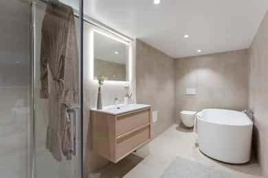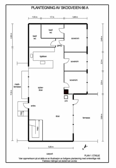 Leiligheten har fått følgende tilstandsgrader i tilstandsrapporten utarbeidet i forbindelse med salget: TG3 (Store eller alvorlige avvik) - 0 stykk. TG2 (Avvik som kan kreve tiltak) - 9 stykk. TG2 (Avvik som ikke krever tiltak) - 0 stykk. TG1 (Mindre eller moderate avvik) - 18 stykk. TG0 - 15 stykk. 1) Taktekking har fått TG2 (Avvik som kan kreve tiltak): Taktekkingen er av betongtakstein fra byggeåret. Taket er besiktiget fra bakkenivå. Siden taket (takkonstruksjon, taktekking og skorstein) er observert fra bakkenivå er vurderingen begrenset av dette. Det er ikke sikkerhetsmessig forsvarlig å bevege seg på taket eller observere fra stige. Selv om det ikke er avdekket skader under befaringen, betyr ikke det at det ikke foreligger skader som en besiktelse på taket kan avdekke. Vær oppmerksom på denne risikoen. En undersøkelse av taket kan utføres av en fagperson under tilstrekkelige sikkerhetsforhold. Punktet må sees i sammenheng med Takkonstruksjon/Loft. Vurdering av avvik: • Mer enn halvparten av forventet brukstid er passert på taktekkingen. • Mer enn halvparten av forventet brukstid er passert på undertak. Konsekvens/tiltak: • Overvåk tilstanden jevnlig. For å få tilstandsgrad 0 eller 1 må tekkingen skiftes ut, men tidspunktet for når dette er nødvendig er vanskelig å si noe om. • Når taktekking og undertak begynner å bli gamle, øker risikoen for lekkasjer, noe som kan føre til omfattende og kostbare reparasjoner av underliggende konstruksjoner dersom en ikke foretar tiltak på konstruksjonene før dette oppstår. 2) Nedløp og beslag har fått TG2 (Avvik som kan kreve tiltak): Takrenner og nedløp i metall. Ført i drensledninger ned i bakken. Stigetrinn for feier montert. Vurdering av avvik: • Det mangler snøfangere på hele eller deler av taket, men det var ikke krav om dette på byggemeldingstidspunktet. • Mer enn halvparten av forventet brukstid er passert på renner/nedløp/beslag. Renner og nedløp er 48 år gamle, og mer enn halvparten av forventet brukstid er passert. Konsekvens/tiltak: • Andre tiltak: • Overvåk tilstanden jevnlig. For å få tilstandsgrad 0 eller 1 må beslag/renner/nedløp skiftes ut, men tidspunktet for når dette er nødvendig er vanskelig å si noe om. Plattform kan vurderes om dette er ønskelig fra feiervesenet. Det bør monteres snøfangere som sikkerhet rundt boligen og spesielt i gåsoner for å unngå ulykker knyttet til at snø raser ifra tak. 3) Veggkonstruksjon har fått TG2 (Avvik som kan kreve tiltak): Yttervegger over grunnmur oppført i bindingsverkkonstruksjon fra byggeåret. Utvendig beiset stående bordkledning. Utv. kledning beiset 2025. Vurdering av avvik: • Det er ingen musesperre i nedre kant av konstruksjon. Konsekvens/tiltak: • Musesperre må etableres. 4) Radon har fått TG2 (Avvik som kan kreve tiltak): Det er ikke foretatt radonmålinger, og bygget er heller ikke utført med radonsperre. Radonsperre var ikke et forskriftsmessig krav da bygningen ble oppført. I følge områdekart fra NGU (Norges Geologiske Undersøkelse) ligger Skogveien 66 innenfor et området med lav/moderat aktsomhetsgrad. Vurdering av avvik: • Det er ikke foretatt radonmålinger, og bygget er heller ikke utført med radonsperre. Konsekvens/tiltak • Det bør gjennomføres radonmålinger. 5) Etasjeskille/gulv mot grunn har fått TG2 (Avvik som kan kreve tiltak): Etasjeskille i trebjelkelag og støpt gulvdekke nede. Nivåforskjell på gulv, kjeller. Ved måling av retningsavvik er det ikke avdekket avvik utover toleransegrensene i 1. etasje. Vurdering av avvik: • Målt høydeforskjell på mellom 10 - 20 mm innenfor en lengde på 2 meter. Tilstandsgrad 2 gis med bakgrunn i standardens krav til godkjente måleavvik. Det er målt ca. 10 mm høydeforskjell på gulv i kjellerstue over en lengde på ca. 2 m. Konsekvens/tiltak: • Andre tiltak: Det er ikke behov for utbedringstiltak. For å lukke avviket må gulv byttes. 6) Innvendige trapper har fått TG2 (Avvik som kan kreve tiltak): Hvitmalt tretrapp med heltre inntrinn. Åpne opptrinn. Rekkverk i glass. Stusstrinn er montert for å forhindre risikabelt store åpninger mellom trinnene. Vurdering av avvik: • Det mangler håndløper på vegg i trappeløpet. Konsekvens/tiltak: • Håndløper må monteres på vegg for å tilfredsstille krav på byggetidspunktet. 7) Avtrekk på kjøkken har fått TG2 (Avvik som kan kreve tiltak): Integrert kullfilter avtrekksvifte i platetopp. Vurdering av avvik: • Kjøkkenet har ventilator med omluft (kullfilter). Konsekvens/tiltak: • Om mulig bør det etableres ventilasjons kanal ut i det fri fra ventilator.